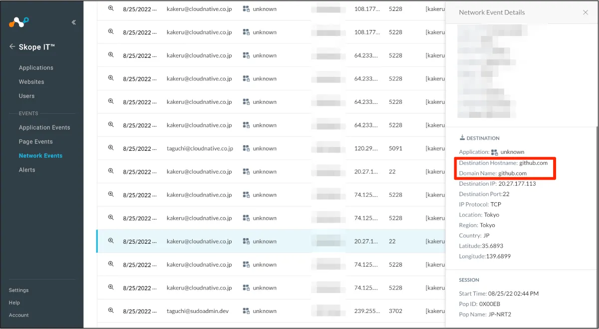 初期設定を完了させると、[ScopeIT] > [Network Events]にCFWのログが上がってきます。送信先IPやポート番号に加えて、アプリによってはHost NameやDomein Nameを確認することができるので、そこからアプリケーションを確認することはできました。(例えばGithubやEC2へのSSHなどは確認できました。)