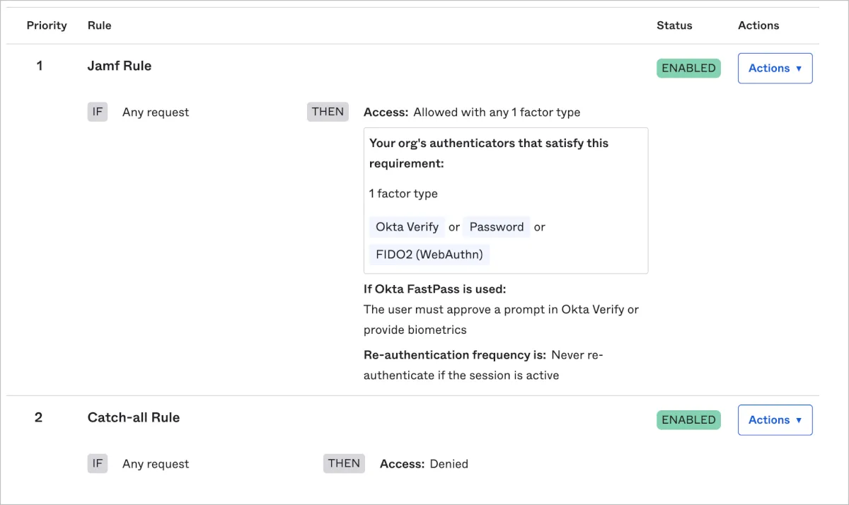 対応としてはJamf関連専用のAuthentication Policyを作成し、以下のようなRuleを作成しDeviceの状態を問わないこととしました。このPolicyに対してJamf関連のSPを紐づけました。