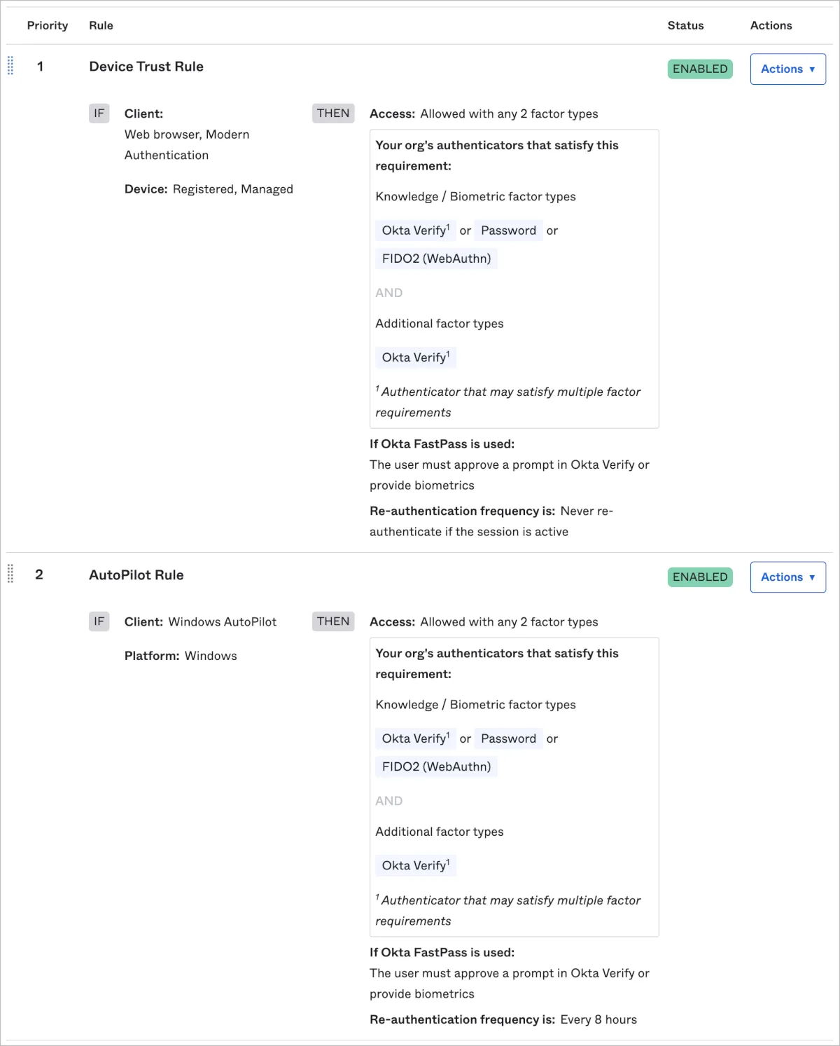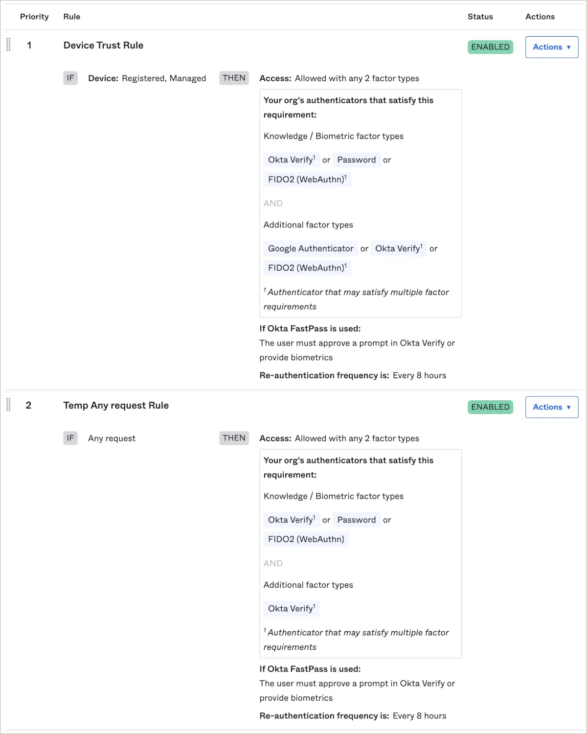 なお、上記それぞれのブログ記事では状況をわかりやすくするため、Authentication PolicyでDevice Trustでない場合はアクセスを拒否する設定していますが、前述したOrg2Orgアプリに対して同様のAuthentication Policyを作成し適用してしまうと混乱が予想されるため、経過措置としてAuthentication Policy配下のRuleを以下のように設定しました。