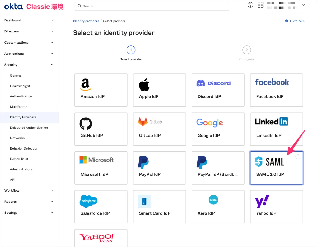 - Classic環境のOkta管理画面でSecurity>Identity Providersに移動し、Add Identity Providerをクリックします。
