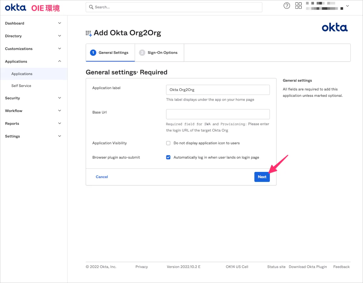 - General Settings画面でApplication labelを確認し、必要に応じて変更し、Nextをクリックします。