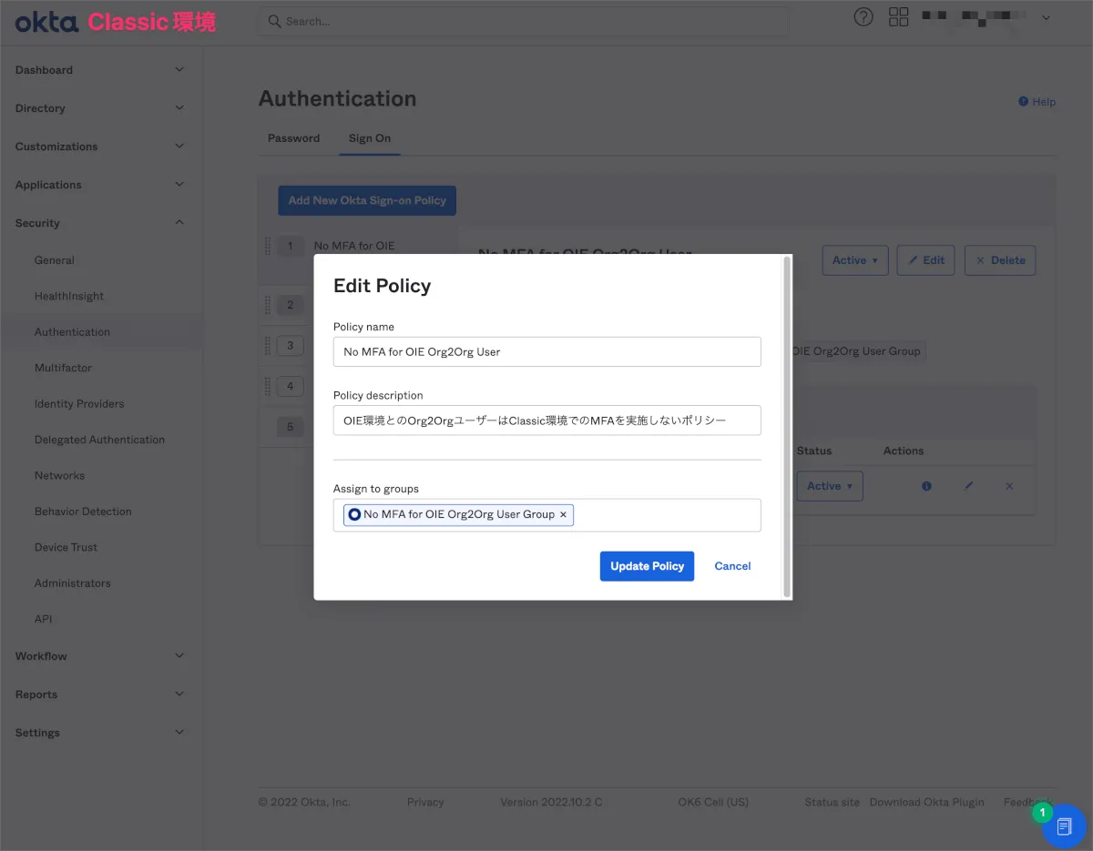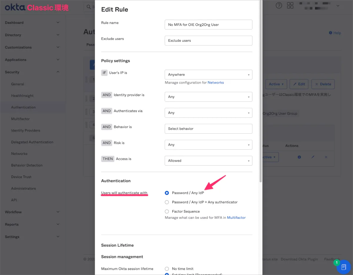 またOIE環境からClassic環境にSSOを行なったあとにClassic環境側のMFAが要求されてしまう状態のため、Classic環境のSign On Policyを変更し、これを回避します。
