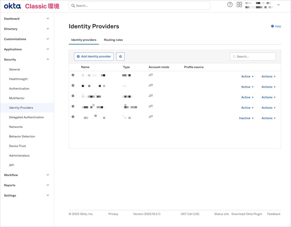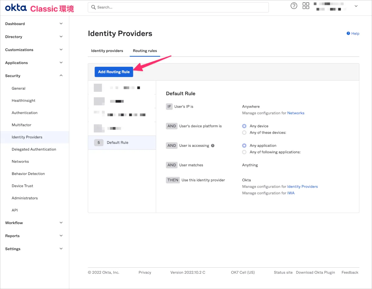 - Classic環境のOkta管理画面でSecurity>Identity Providersに移動し、Routing rulesからAdd Routing Ruleをクリックします。