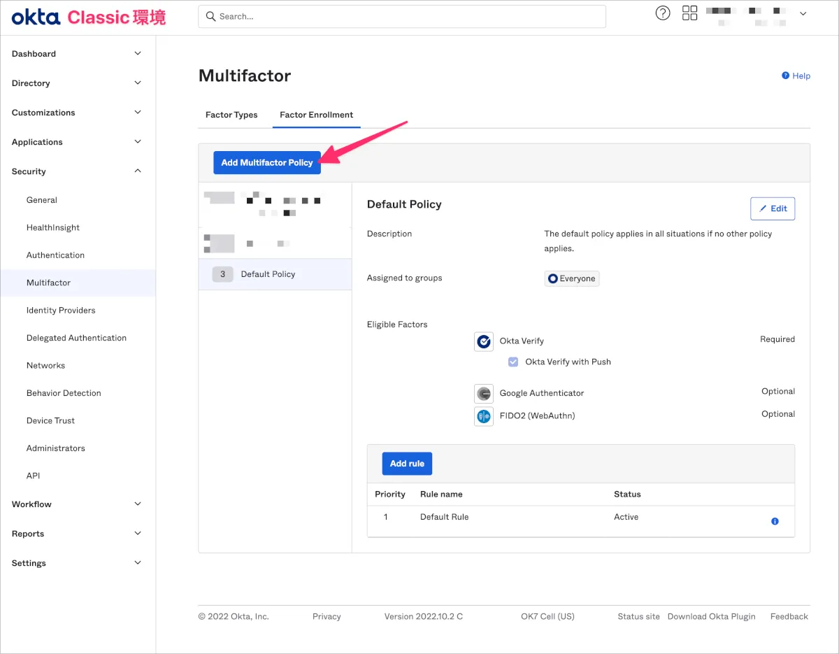 - Classic環境のOkta管理画面でSecurity>Multifactorに移動し、Factor EnrollmentタブからAdd Mulitifactor Policyをクリックします。