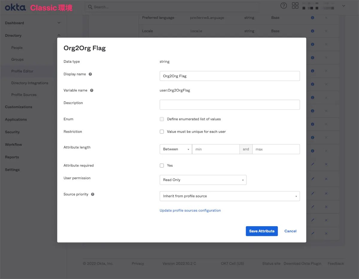 - Classic環境のOkta管理画面でDirectory>Profile EditorからOkta(user)をクリックします。