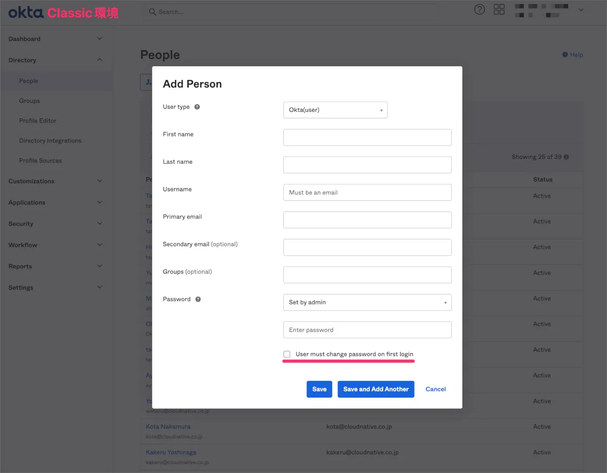 この状況ではClassic環境で新入社員のアカウントを作成する際に初回ログイン時のパスワードの変更要求はOffとします。このように設定することで新入社員はOIE環境のOktaアカウント初期セットアップのみでClassic環境でのOktaアカウント初期セットアップについて操作を行う必要がなくなります。