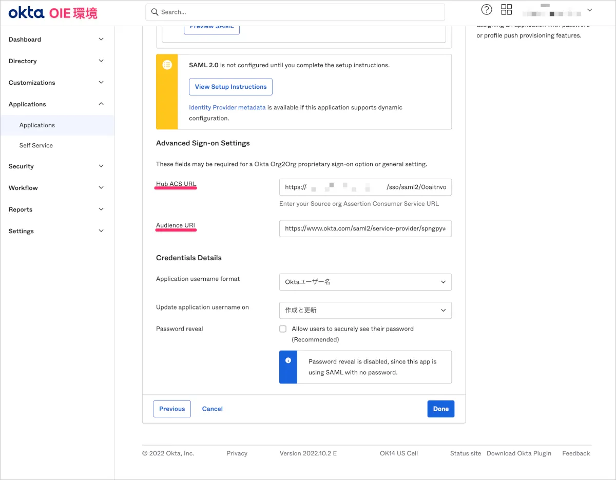 - 4.で開いたままのOIE環境のSign-On Options画面でAdvanced Sign-on SettingsのHub ACS URLに8.で表示されたAssertion Consumer Service URLを入力します。