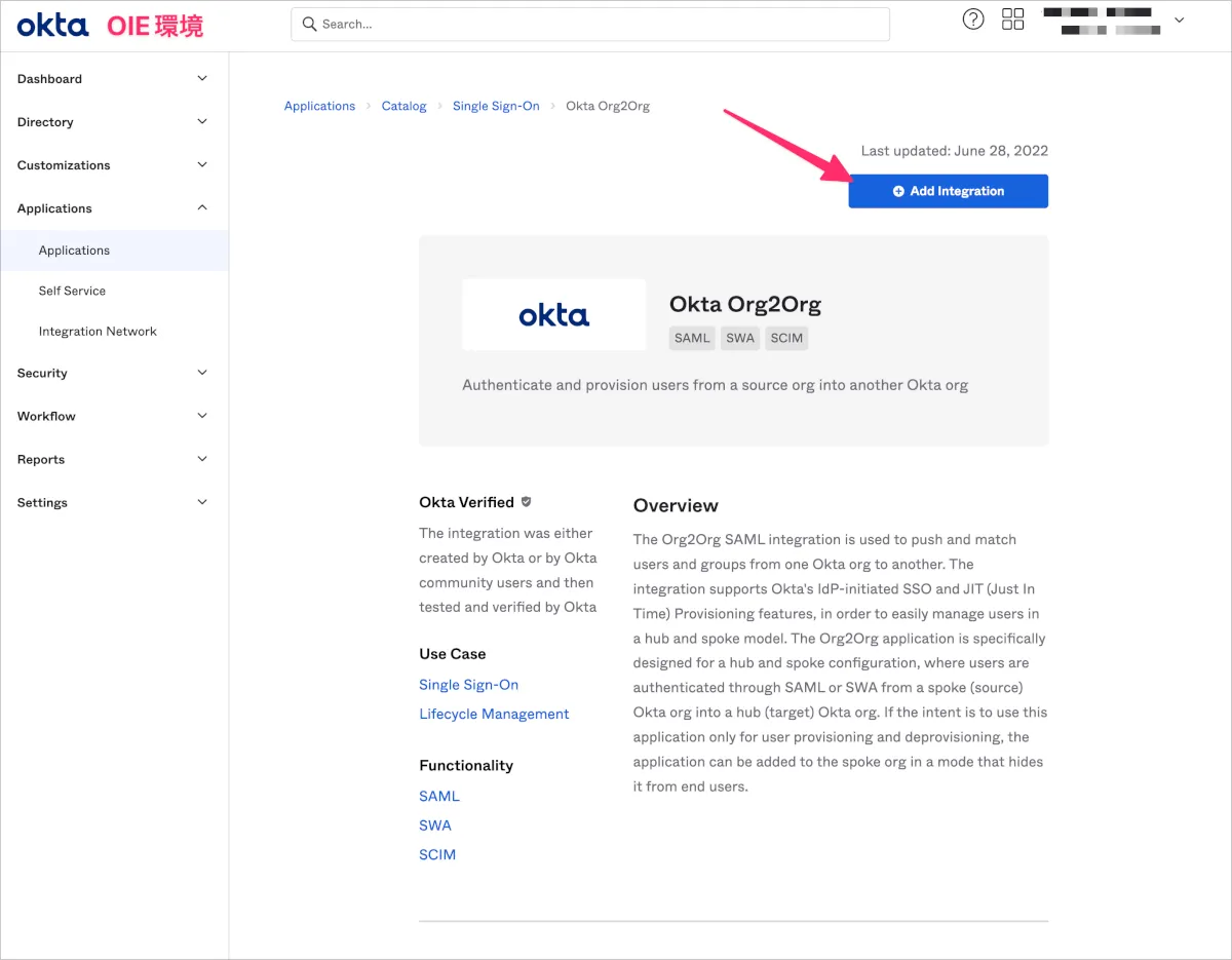 - OIE環境のOktaダッシュボードからOkta Org2OrgアプリをクリックすることでClassic環境にOIE環境の認証情報を用いてSSOが行えることを確認します。