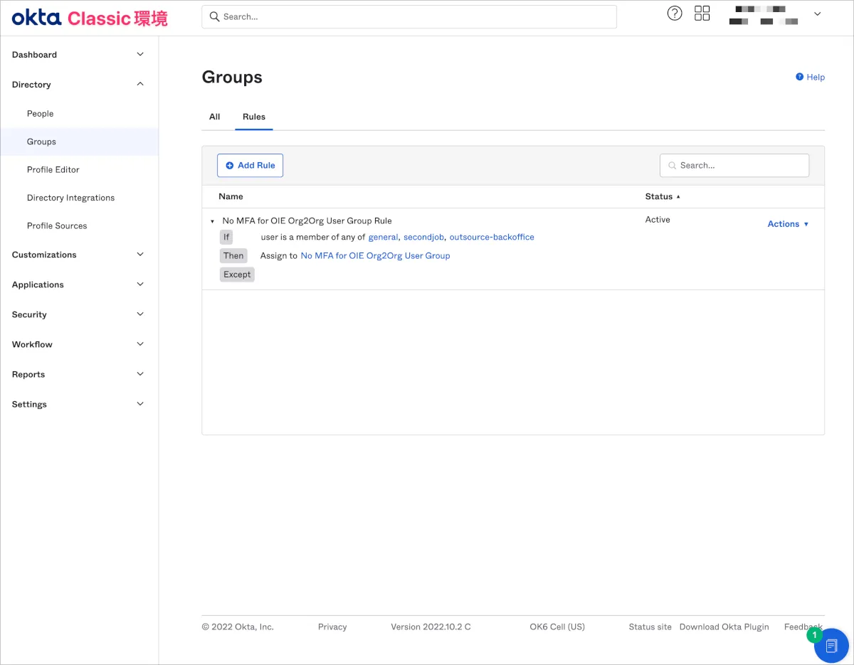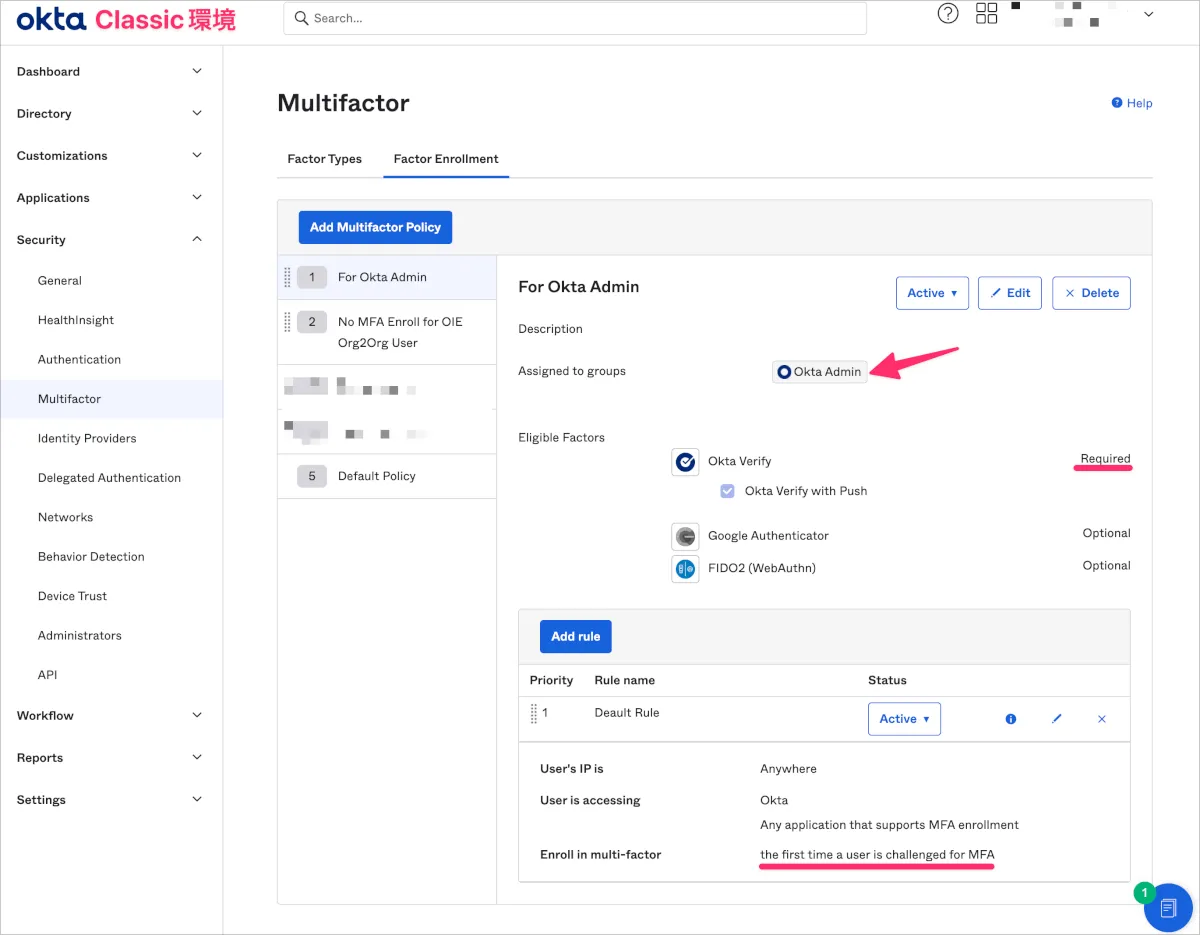 新入社員のためにOktaアカウント初期セットアップの段階でMFAの登録を除外するためのPolicyを作成します。ただし、Classic環境のOkta管理者はAdminダッシュボードにアクセスするためにMFA登録が必要なため、そのPolicyも作成します。