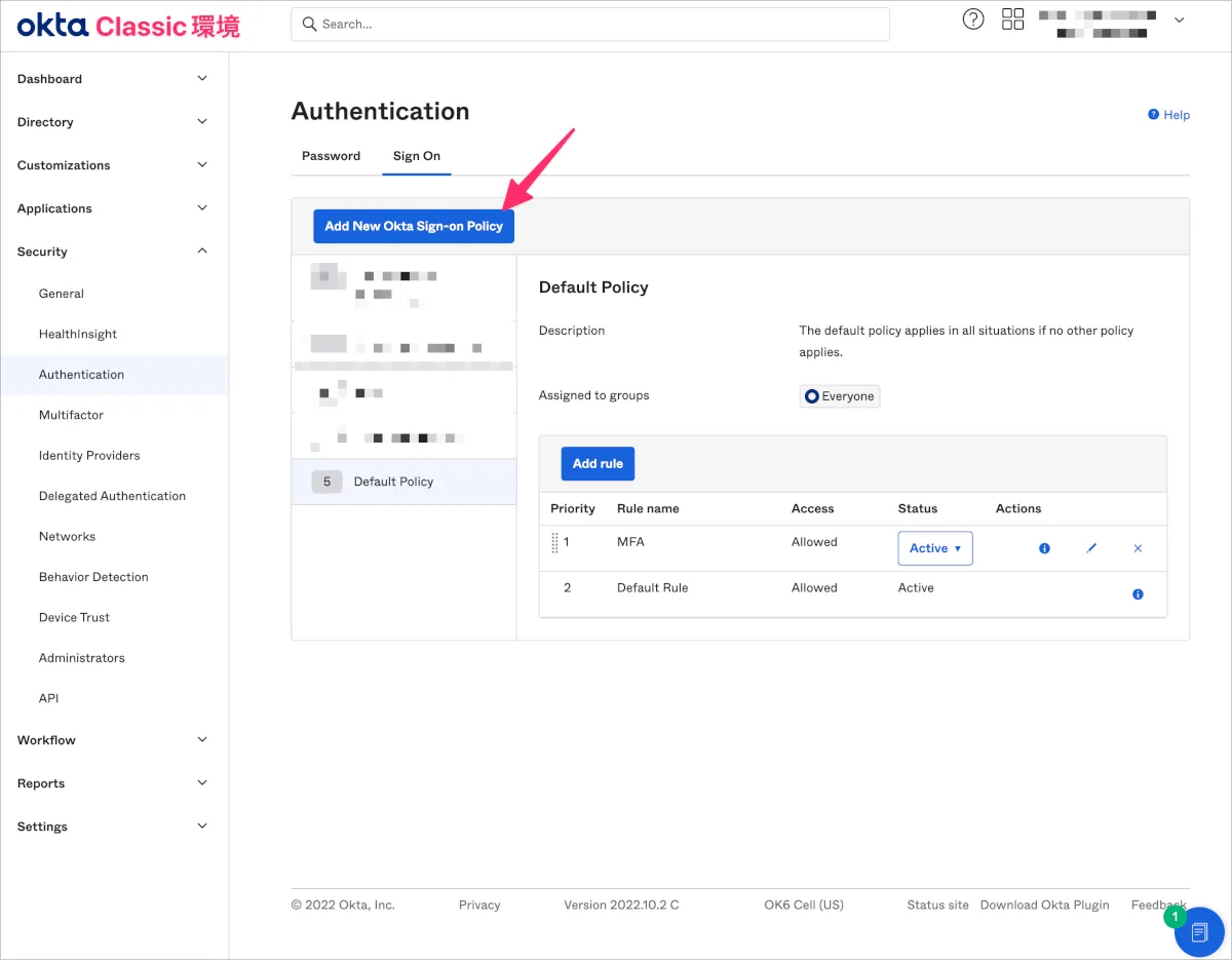 - Classic環境のOkta管理画面でSecurity>Authenticationに移動し、Sign OnタブからAdd New Okta Sign-on Policyをクリックします。