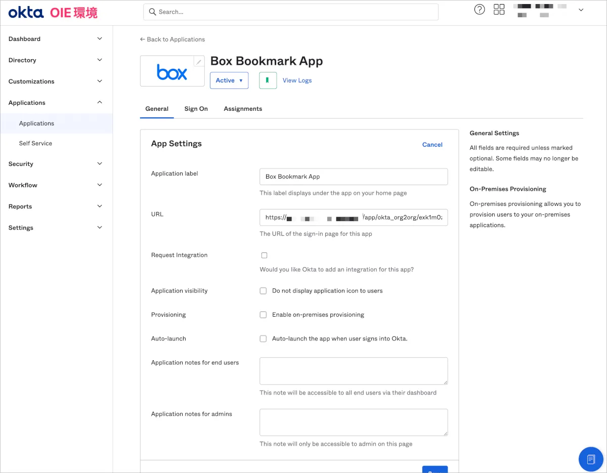 Classic環境の対象アプリのGeneral内のEmbed Linkがhttps://example-classic.okta.com/home/boxnet/xxxxxx