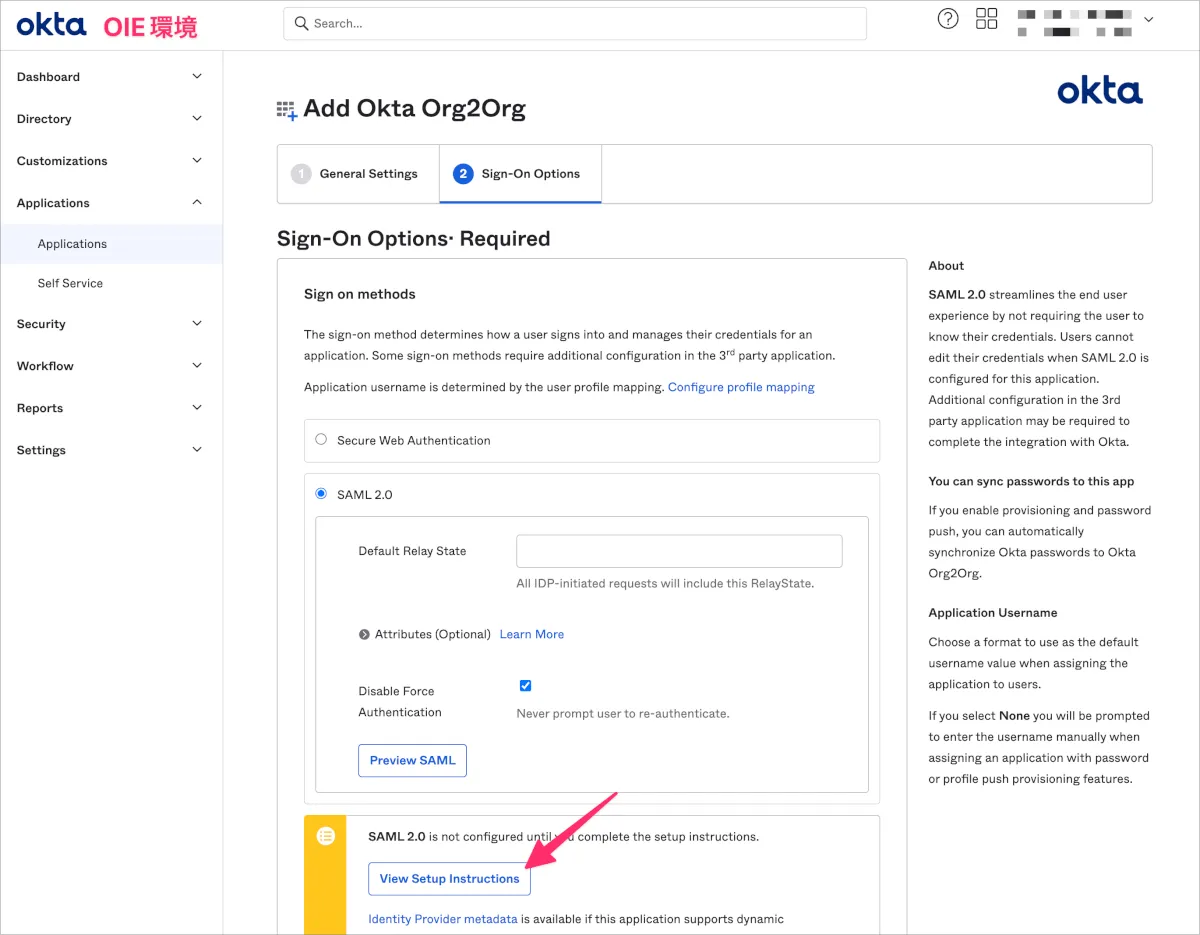 - OIE環境のView SAML setup instructionsに表示された内容を参考に設定を行います。