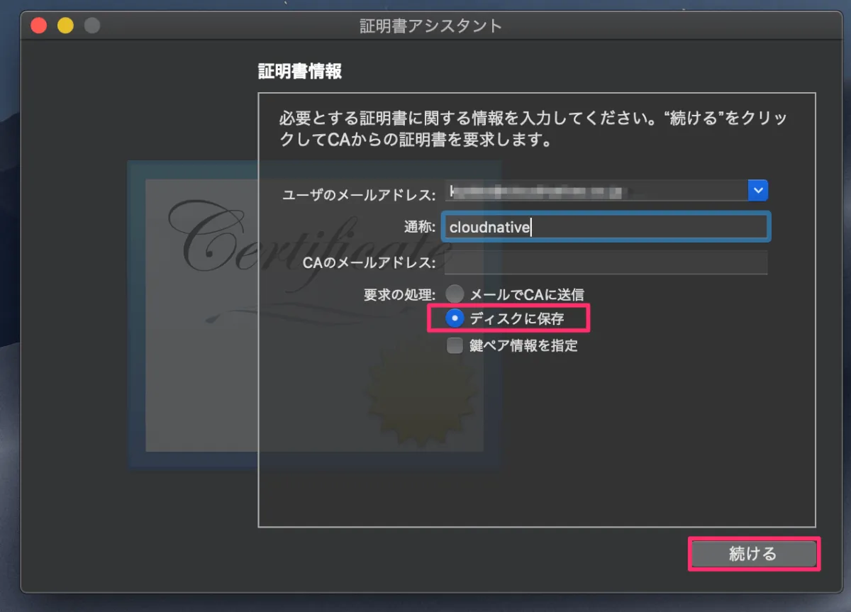 - [ユーザーのメールアドレス] および [通称] に任意の情報を入力します。[通称] で入力した名前で証明書が表示されます。