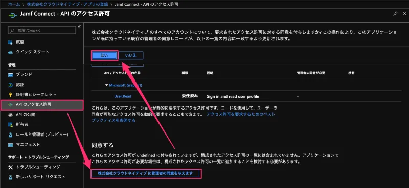 - [ *** に管理者の同意を与えます] をクリックして [はい] を選択します。