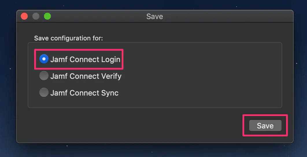 - メニューバーの [File] > [Save] をクリックして表示されたウィンドウで Jamf Connect Login を選択して保存します。