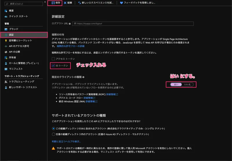 - [暗黙の付与] で [IDトークン] にチェックを入れます。