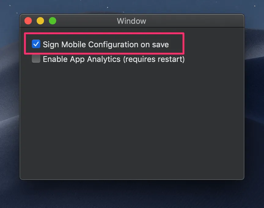 デフォルト設定では、構成プロファイルを保存する際に署名を署名を求められるようになっていません。なので求められるように設定を変更します。