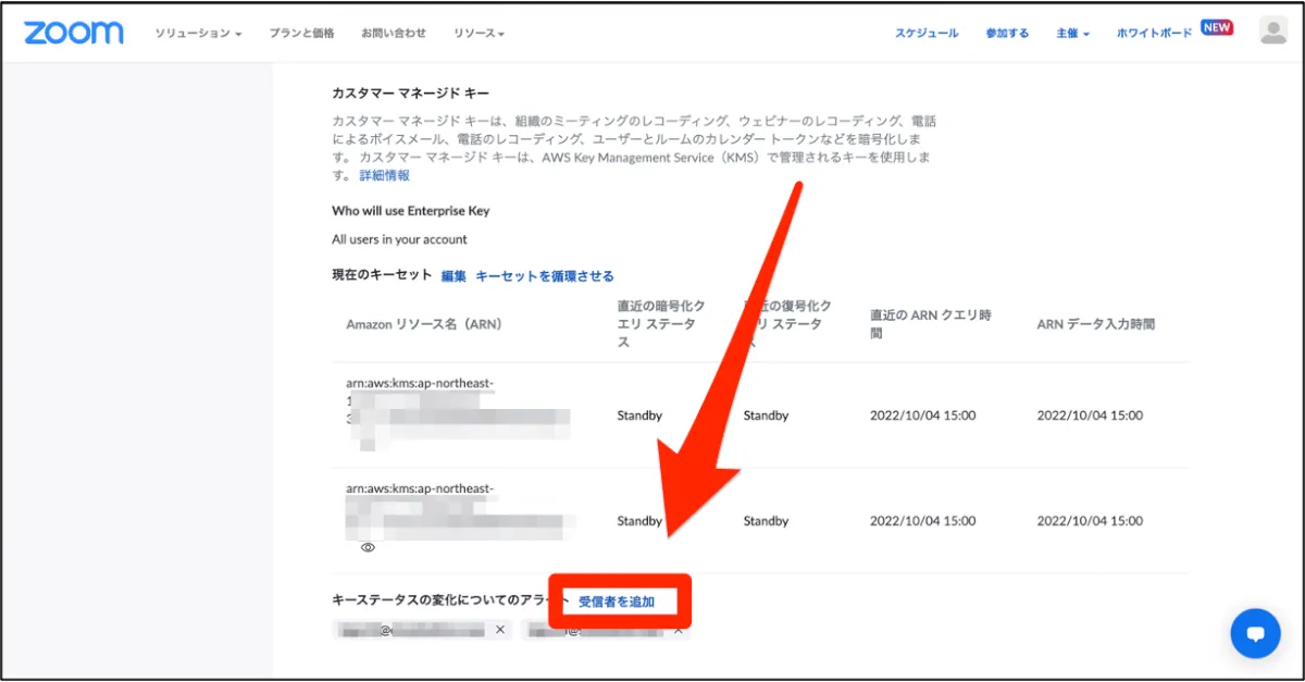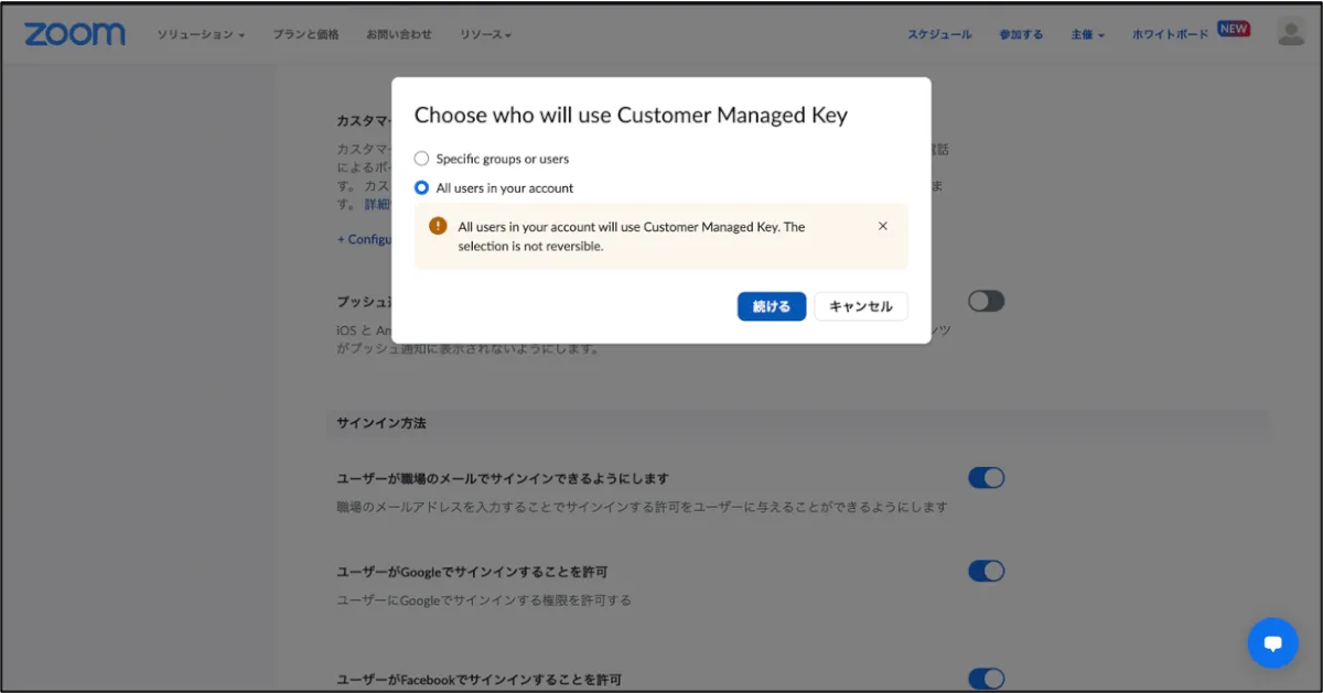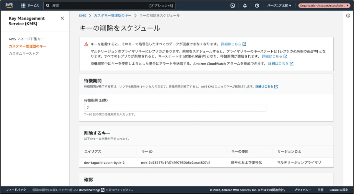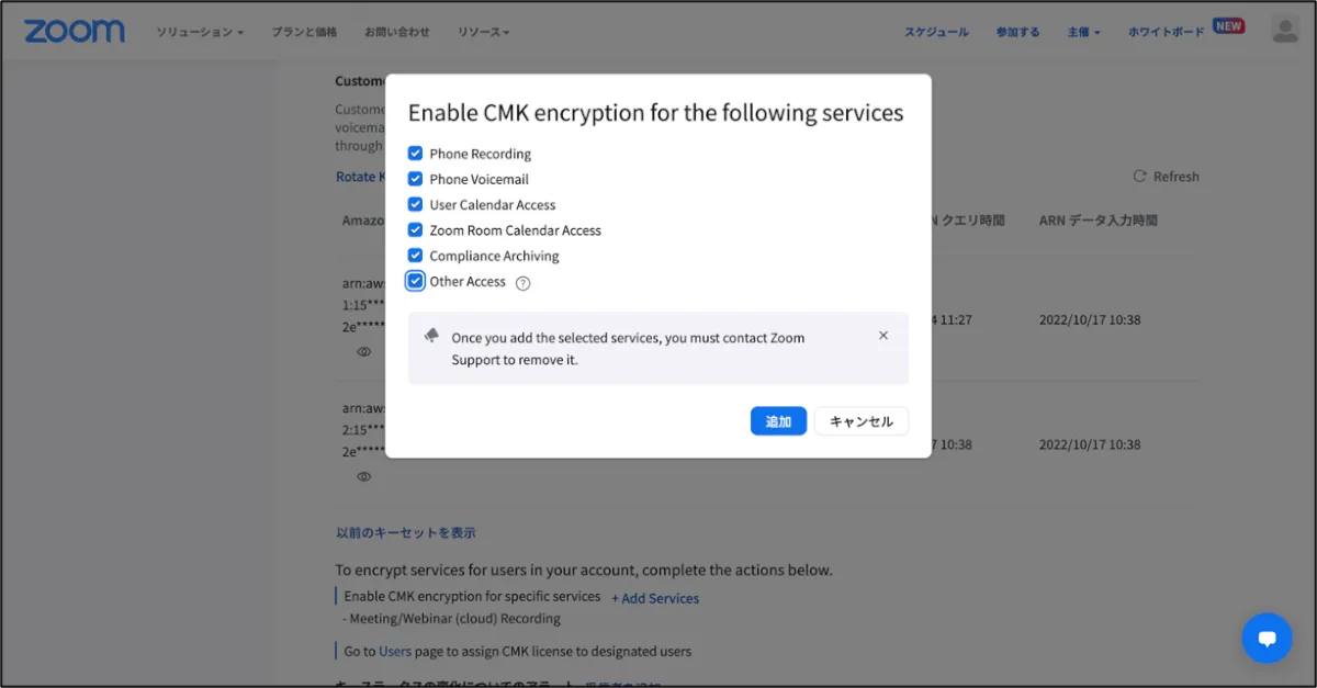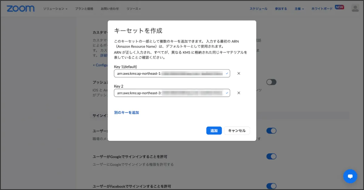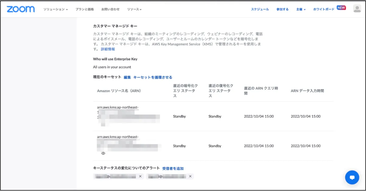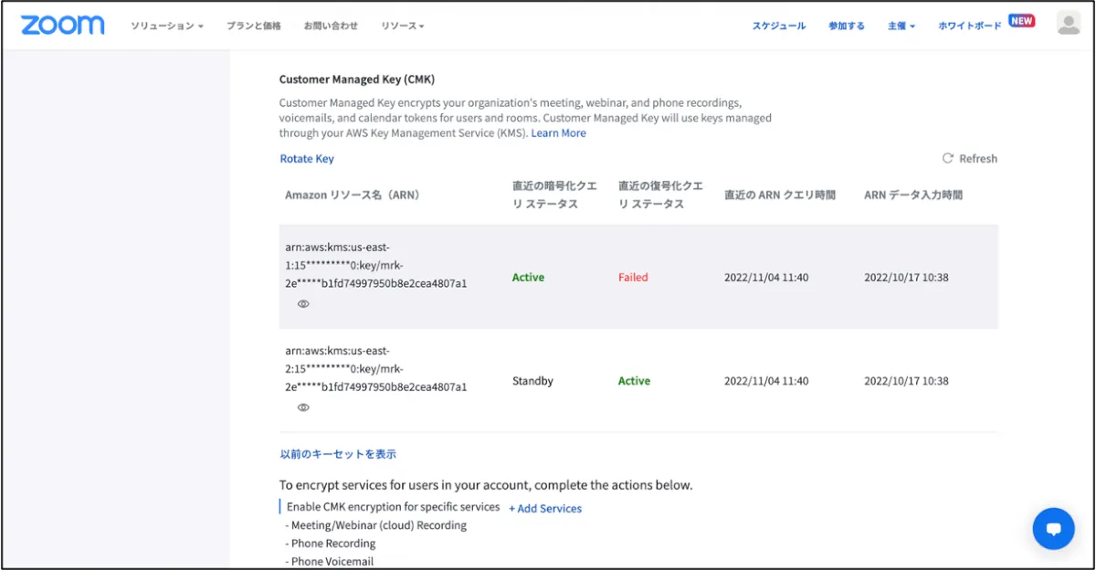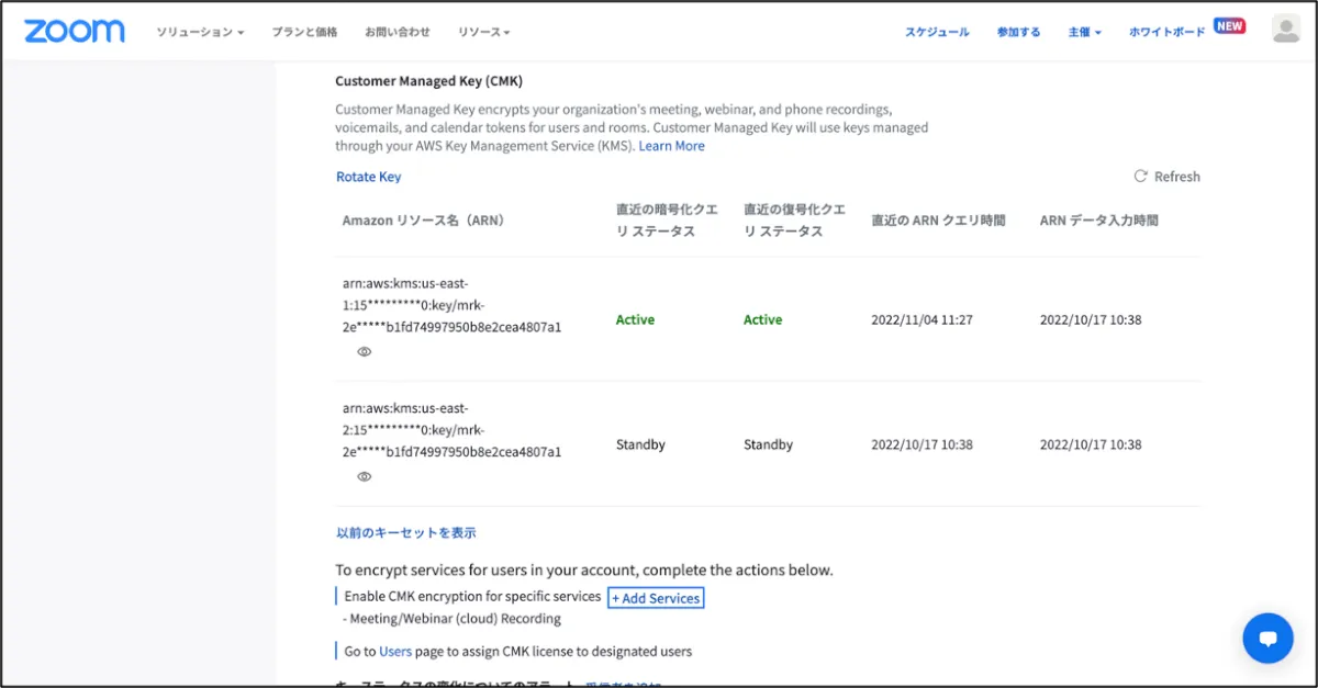 - 現在、Zoom CMK で利用できる鍵はAWS Key Management Service (AWS KMS) 上にある鍵のみが対象となります。