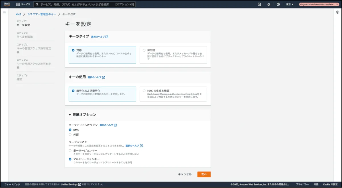 まず、AWSのアカウントを用意して、BYOKで利用する鍵を生成します。[AWS管理コンソール] > [KMS] でカスタマー管理型のキーを生成しましょう。作成の際の設定値は以下の通りです。尚、BYOKはリージョン指定がされていることがありますが、Zoomに関してはリージョンについては指定は特にありません。私は、東京リージョン(northeast-1)、大阪リージョン(northeast-3)、バージニア(us-east-1)、オハイオ(us-east-2)を試しました。