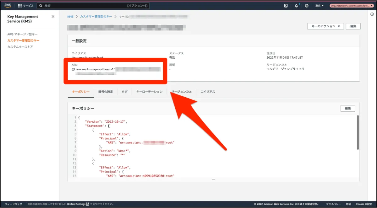 キーポリシー(キー仕様アクセス許可設定)には、以下を登録しました。尚、「409910850980」の部分は変更不要ですが、「自社のASWアカウントIDを入れてね」の部分は鍵を設置したAWSアカウントのIDに変更してください。また、このキーポリシーはレプリケートされたマルチリージョンキー間で同期されず、個別に設定する必要があるためご注意ください。