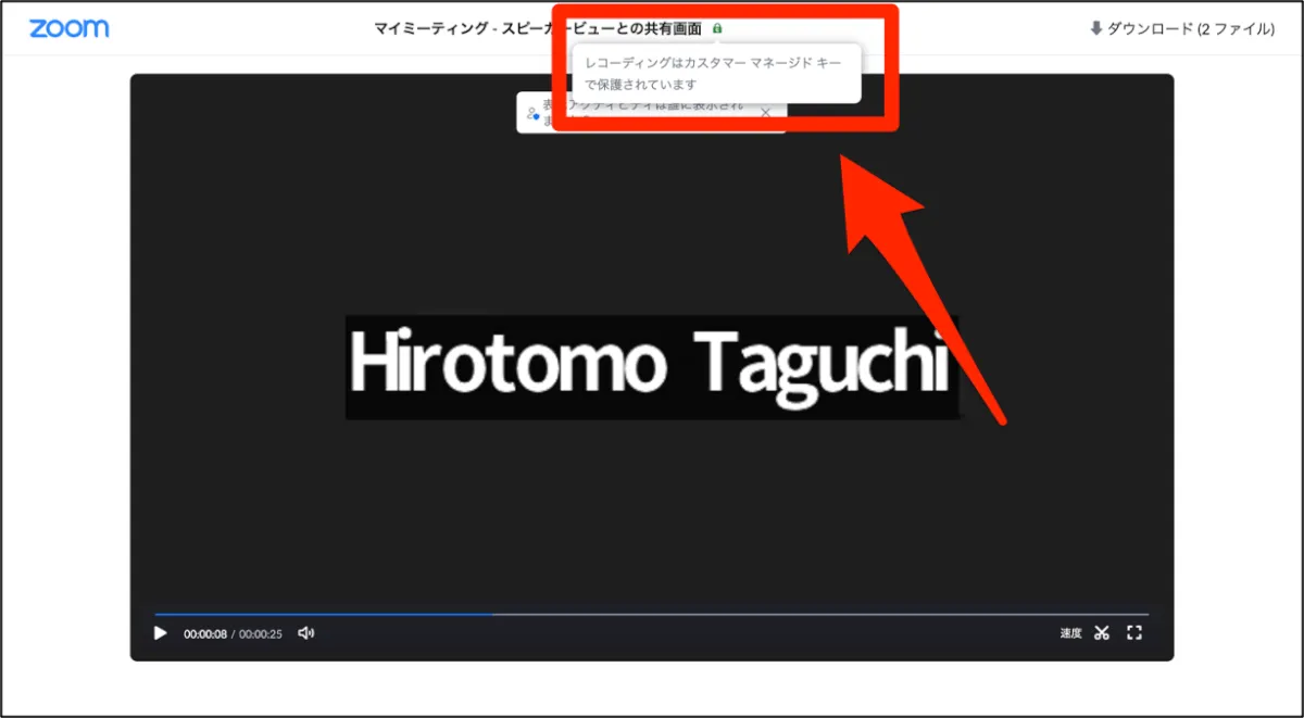 個別の録画にアクセスした場合、BYOKが適用されている証として、上の部分(下記画像赤枠)にマークが出現します。ちなみに、Zoom CMKで暗号化できるデータは、CMKを適用した状態で生成された録画データであり、CMKを適用する前に生成された録画データは対象外のようです。