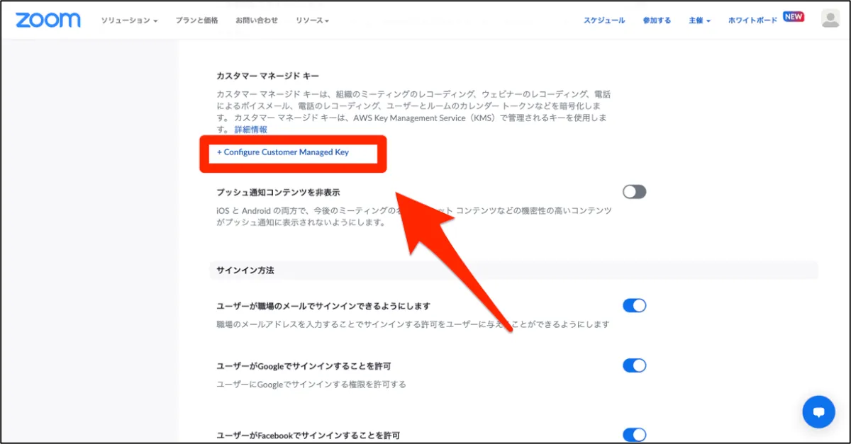 次に、Zoom側の管理画面の[詳細設定] > [セキュリティ] に遷移し、[Configure Customer Managed Key]を選択します。