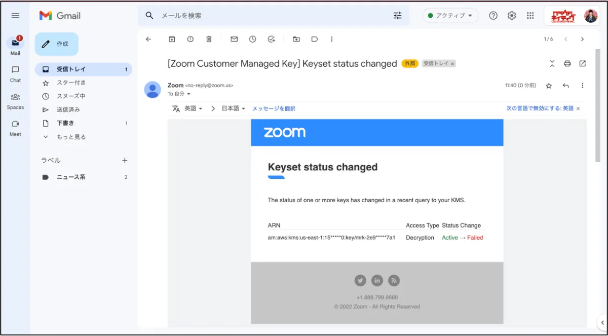 ちなみに、KMSの鍵が動作していないことをZoom側が検知すると、以下のようなアラートのメールを発報してくれました。