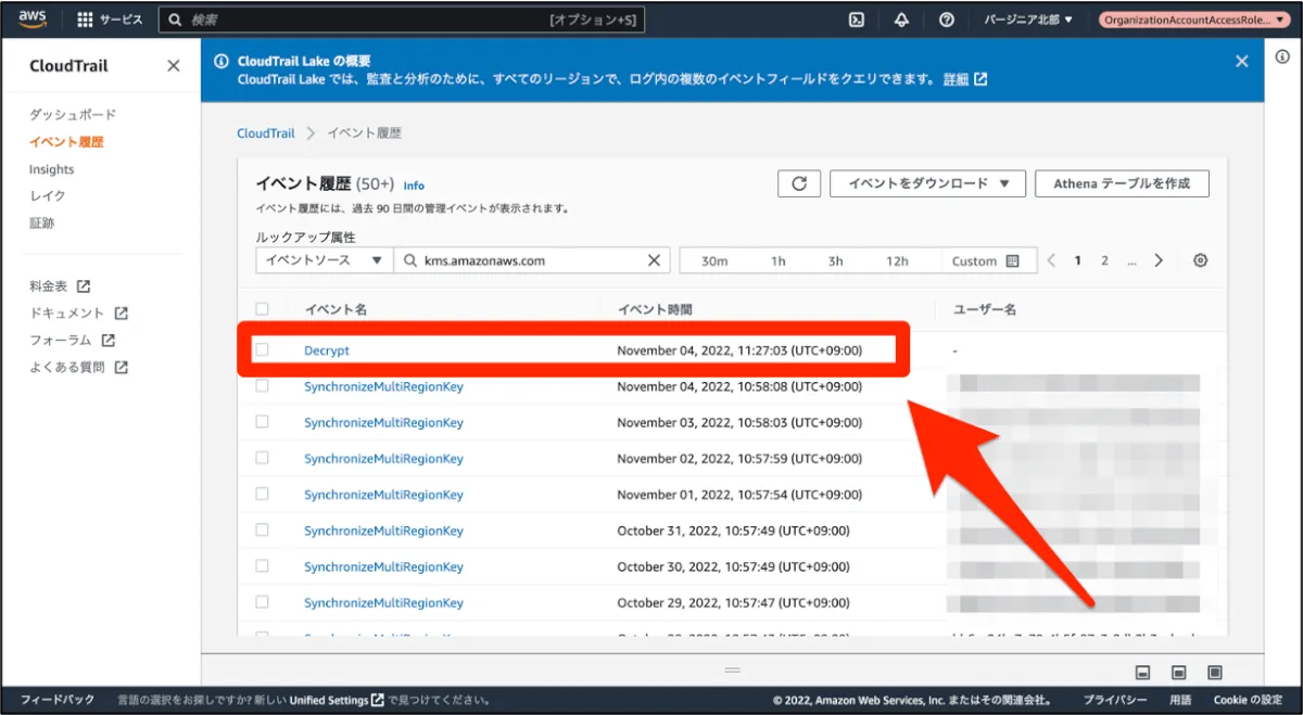 AWS のCloudTrailを確認すると、録画データにアクセスしたり、ダウンロードした時間に、AWS KMSで復号されるイベントが発生していることがわかりました。