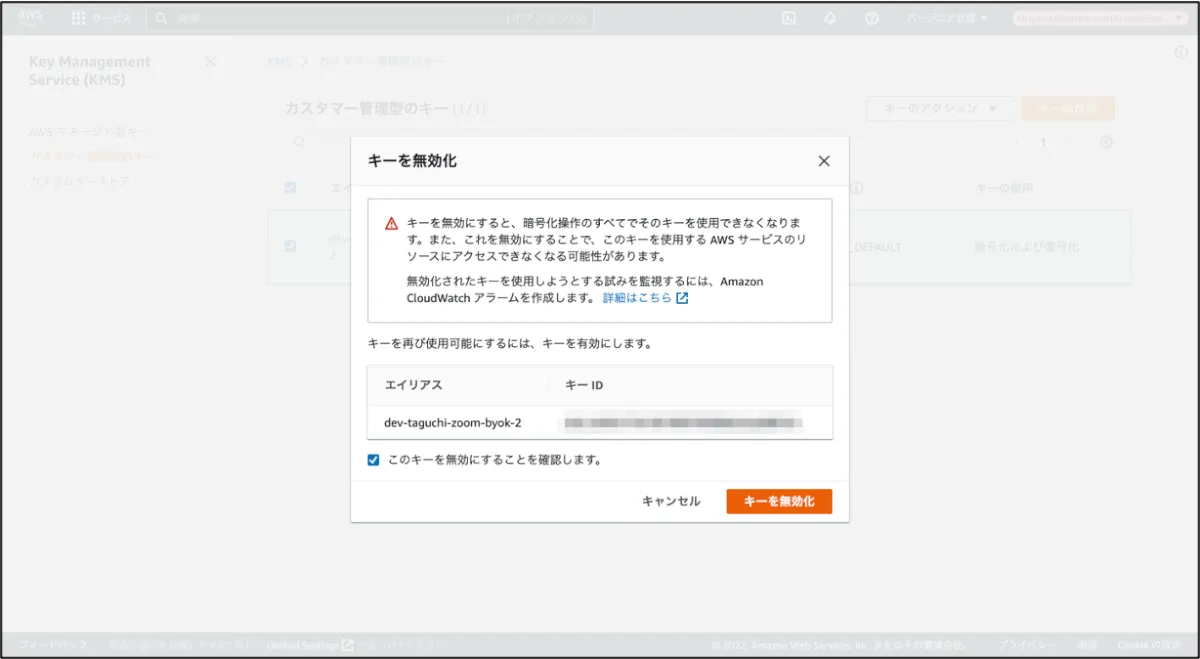 動作確認をしましたが、正直、BYOKでデータが暗号化されているかの実感が湧きません。暗号化マークは出現するものの、ユーザー体験としては何も変わることがなかったため、逆に「BYOKをやった気になっただけでは?」とちょっとだけ不安になりました。ということで鍵を破壊(無効化)して、本当にBYOKが実施されているか確認してみることにしました。まず、AWS上でキーを無効化してみます。