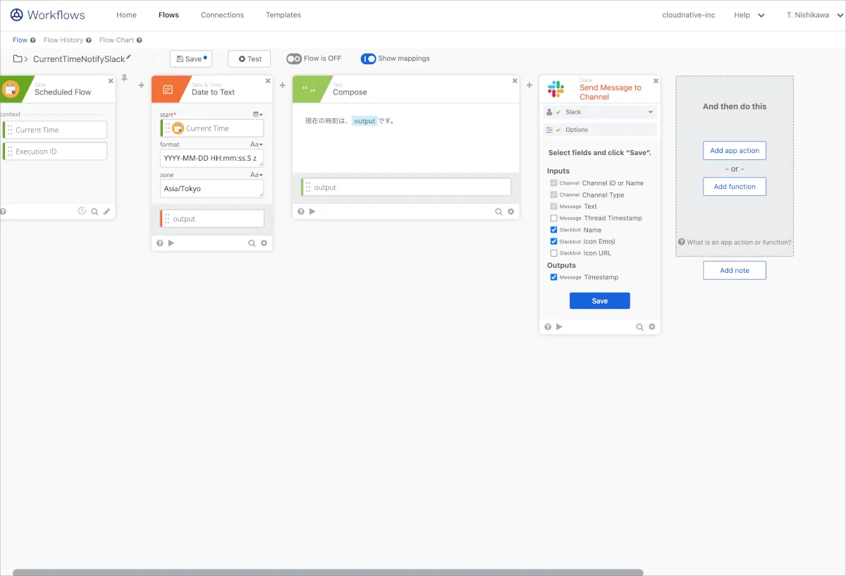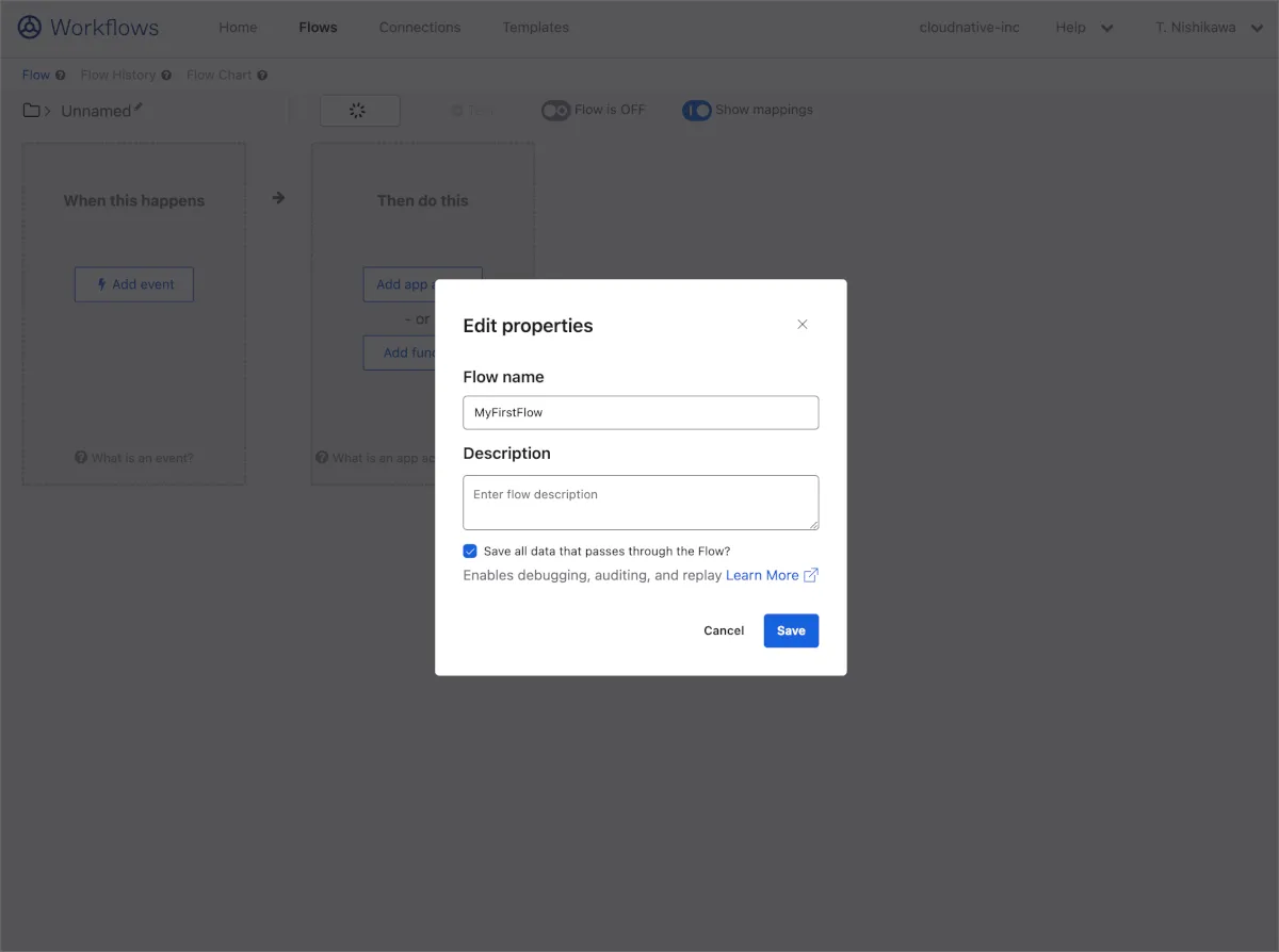 この時にSave all data that passes through the Flow?にチェックを入れることでFlowが実行された時の履歴が保存されます。デバッグの際にとても重要になりますので最初の段階でチェックを入れて保存を行なっておきましょう。