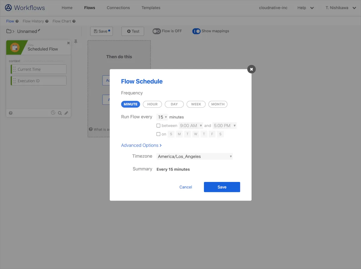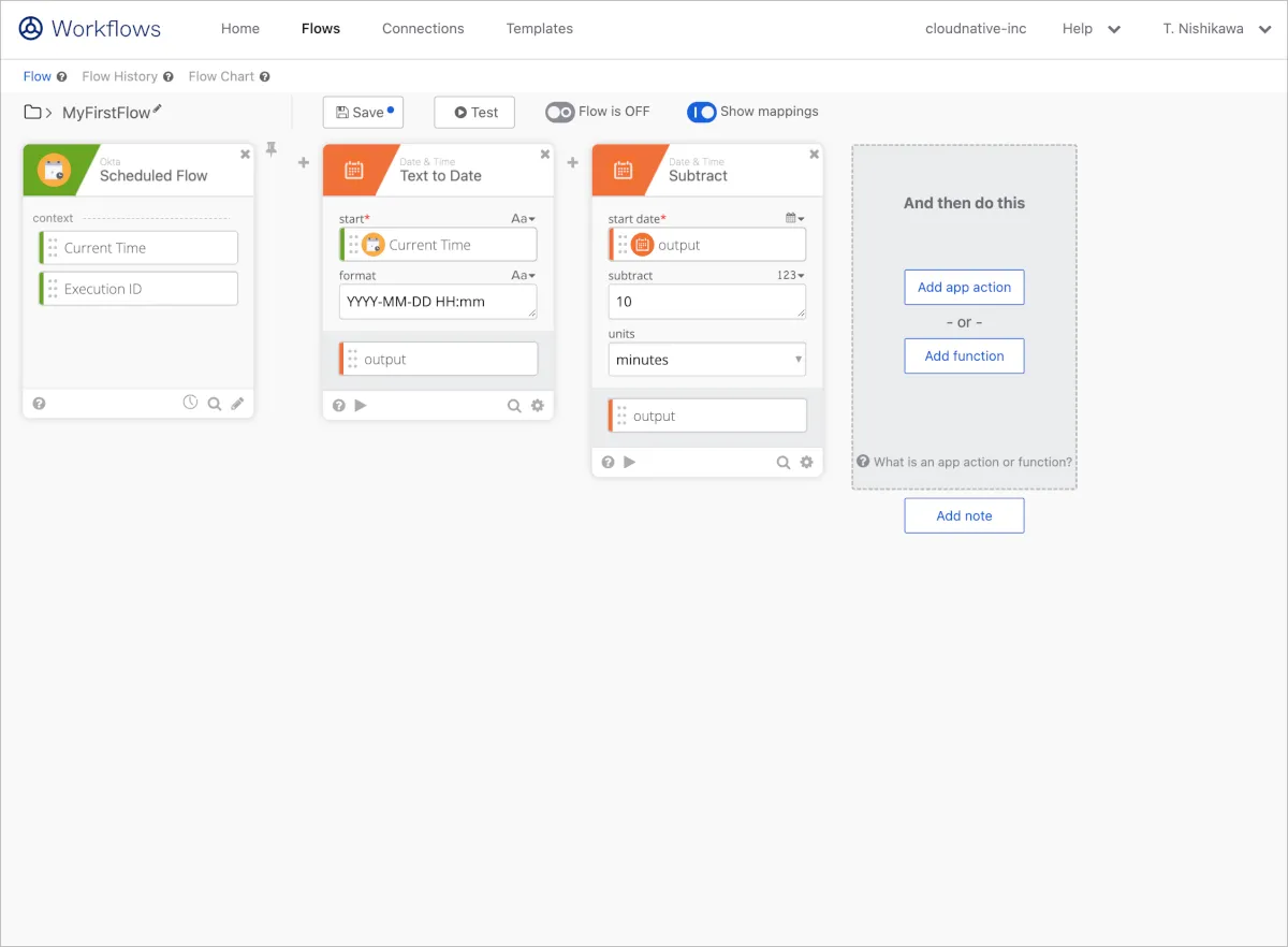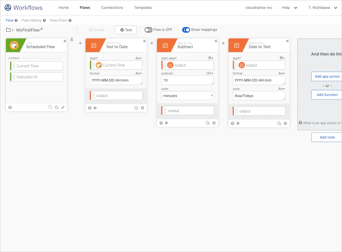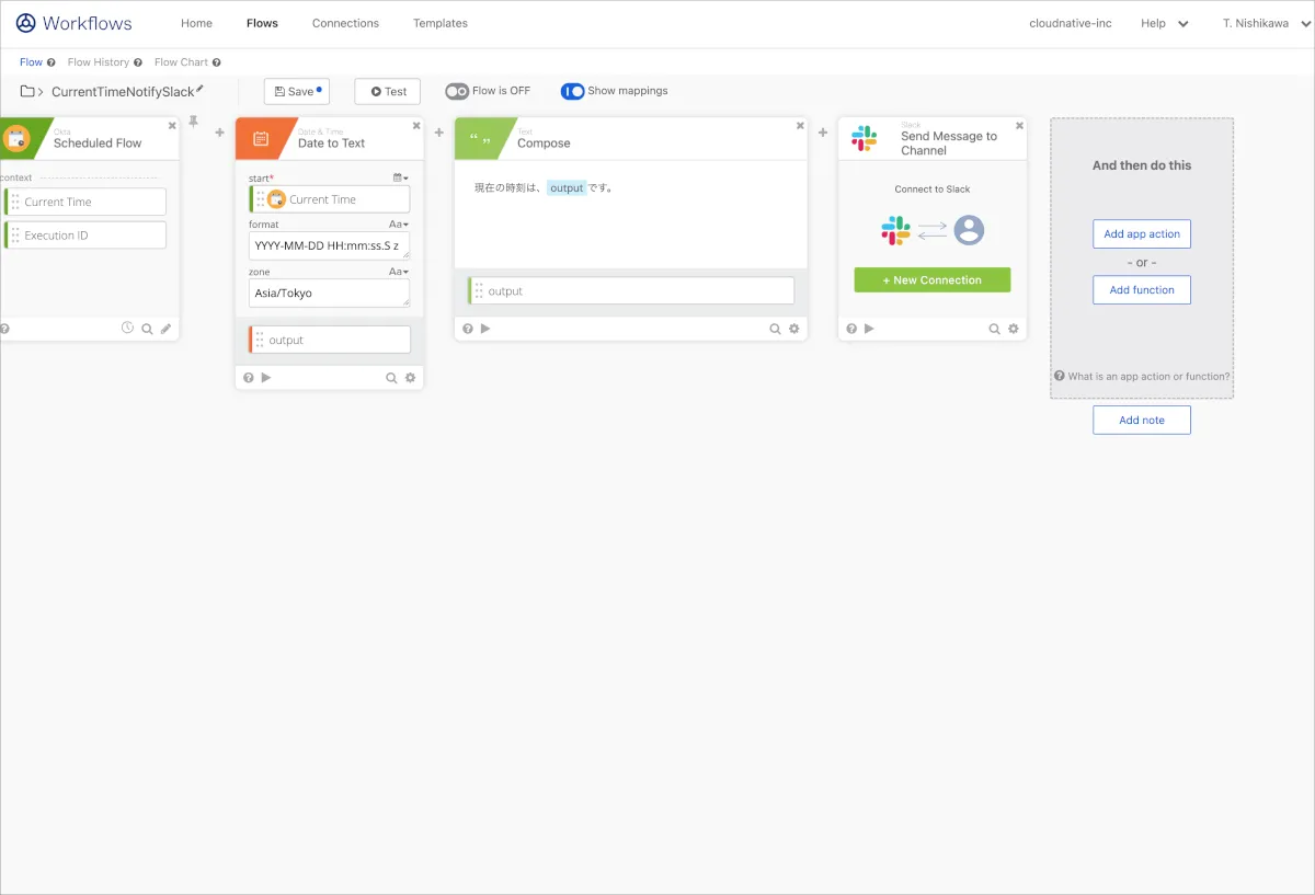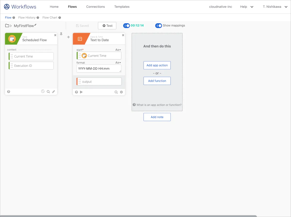 下図ではトリガーカードであるSchedule FlowのCurrent TimeをText to DateのStartに指定しています。formatをYYYY-MM-DD HH:mmとすることで秒単位以下の端数を均して00.000秒としています。