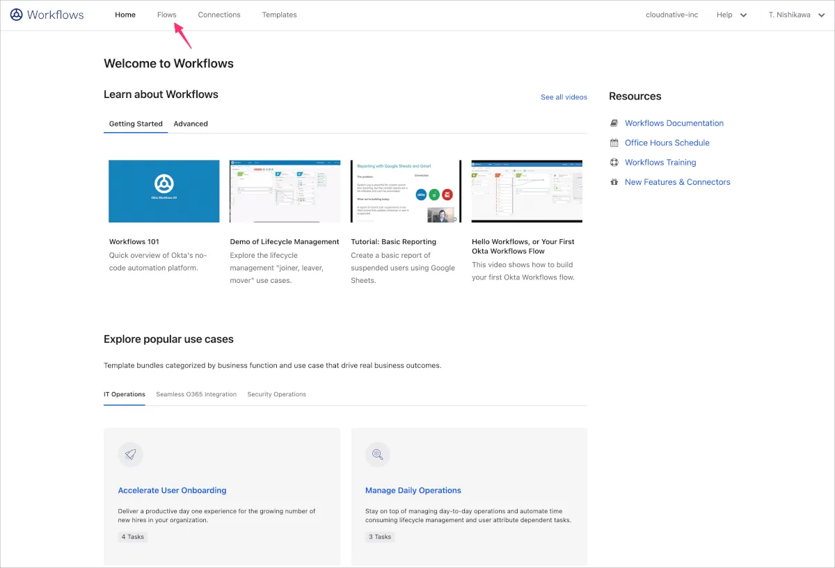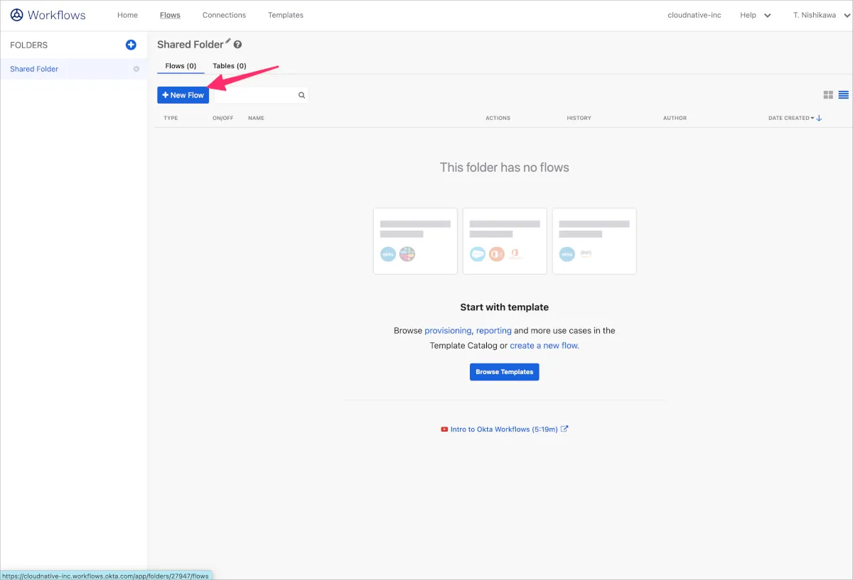 Flowを作成するにはOktaのSuper Administrator権限が必要です。さらにOkta管理画面でOkta Workflowsという名称のアプリケーションにSuper Administrator権限があるユーザーをアサインする必要があります。