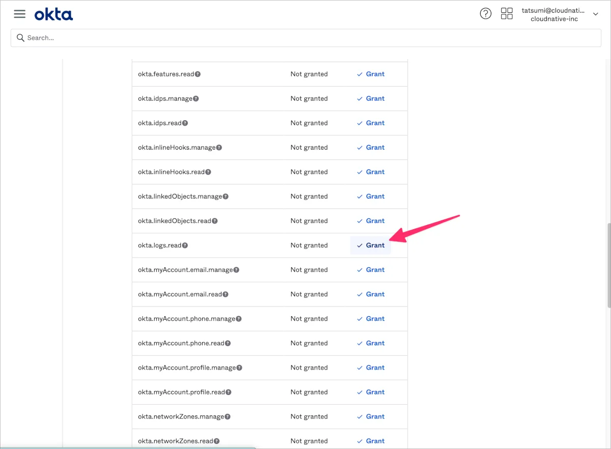 OktaのシステムログをAPIを実行して確認したい場合はokta.log.readの権限付与を行う必要があります。