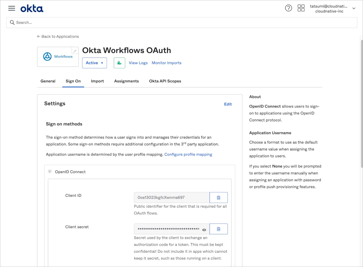 Client IDおよびClient SecretはOkta Workflows OAuthアプリケーションのSign Onタブに記載がありますのでそれぞれコピー&ペーストを行います。