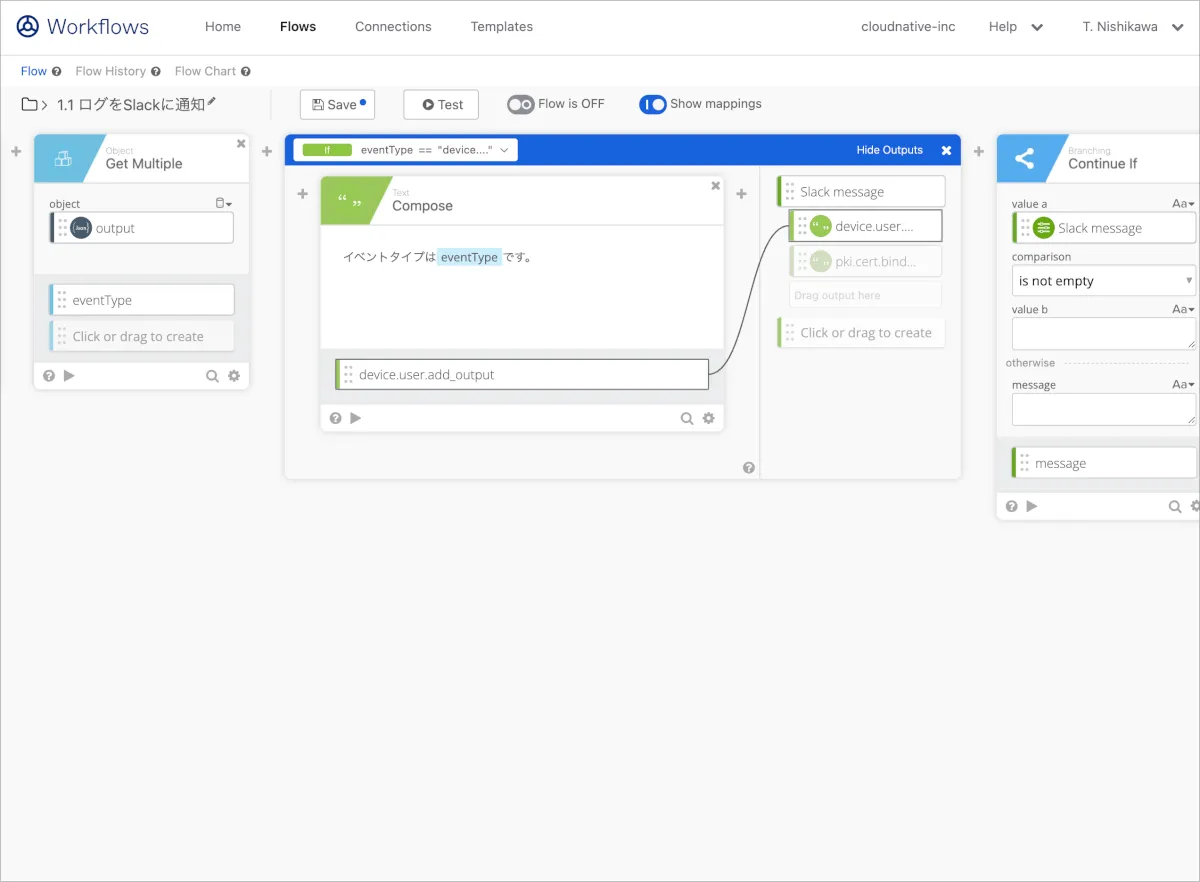 メッセージには変数を利用することができるため、以下のようにComposeより前で必要な変数を作成しておき利用します。日本語の入力や変換時に少し癖があるのでテキストエディタであらかじめ文章を作成しておきペーストするのがおすすめです。