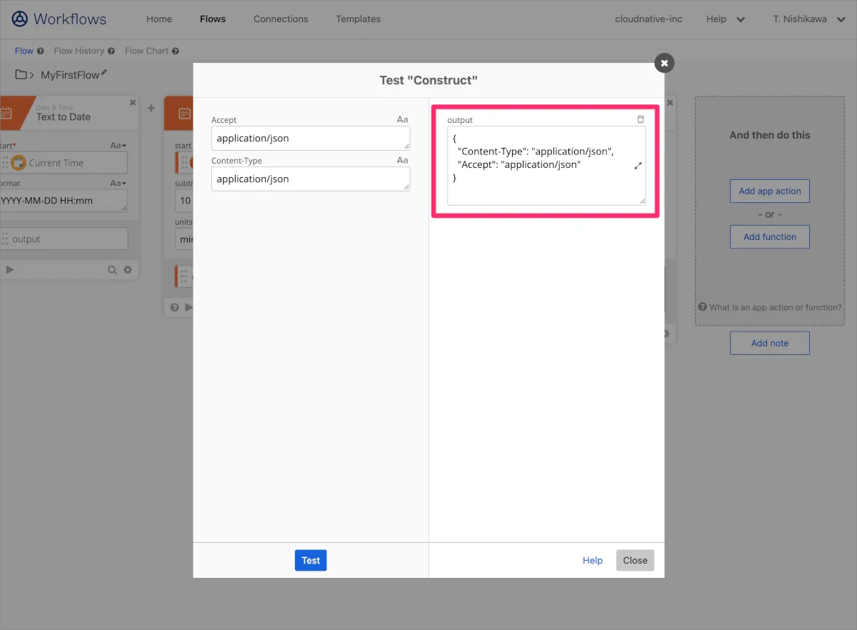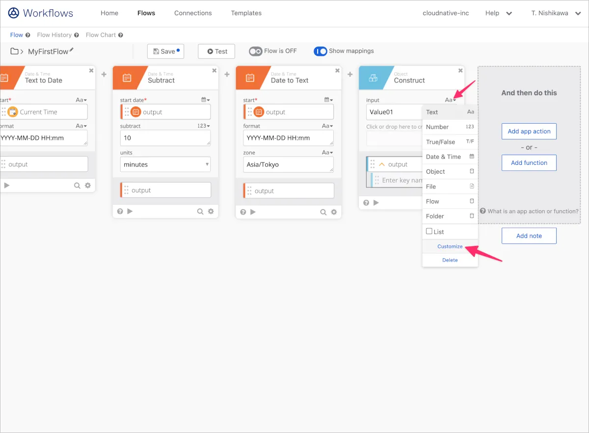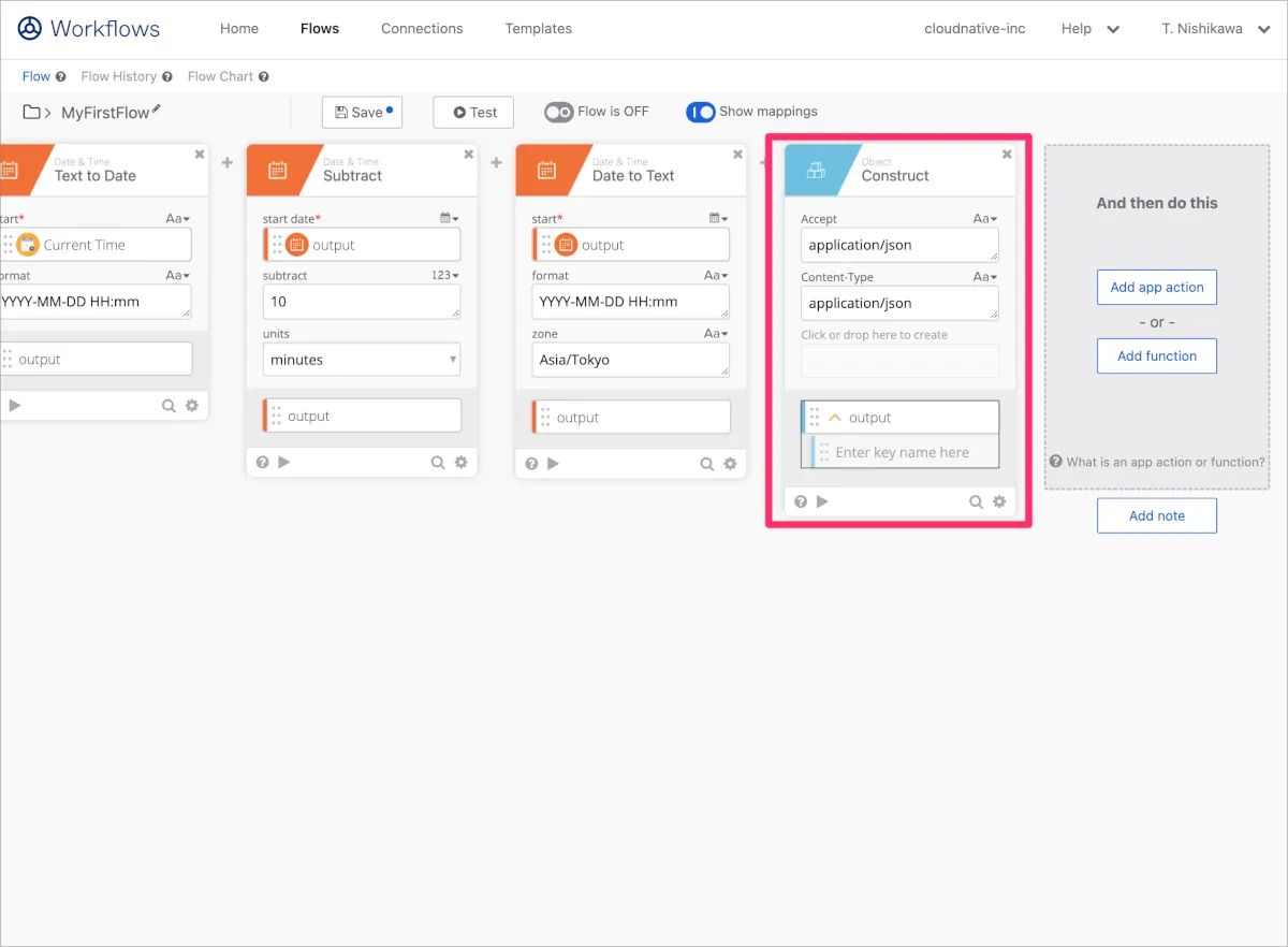 日付データをフォーマットとタイムゾーンを指定して出力することができます。Okta Workflowsの日付データはUTCで保存されているため、JSTに変換したい時によく利用します。以下のようにZoneでAsia/Tokyoを指定します。