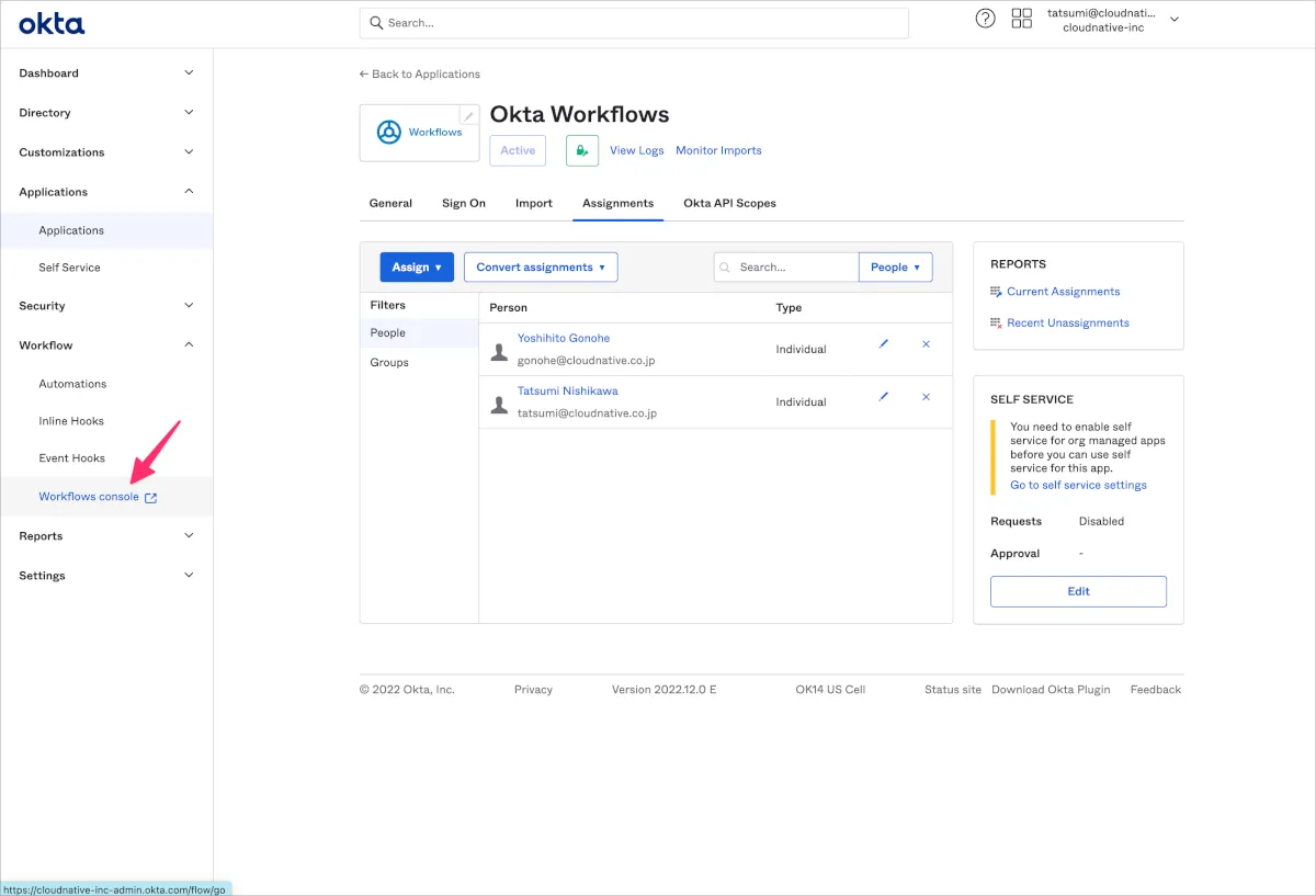 アサインが完了したらOkta管理画面のWorkflow>Workflows consoleをクリックします。