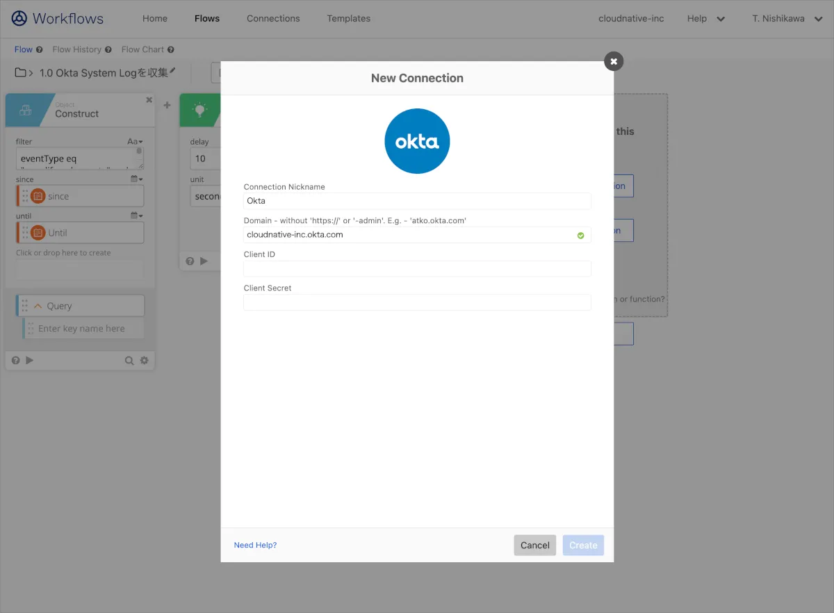 Oktaに対して既存で用意されているアクションでは行えないことを実行するために利用します。はじめて利用する場合はNew Connectionから設定を行う必要があります。