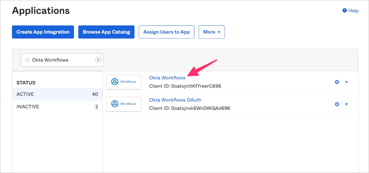 また、Okta Workflows OAuthという名称のアプリケーションもありますがこちらはOkta WorkflowsがOktaに対して操作を行う時のAPI許可を管理するものです。こちらにも同様にアサインを行なっておきます。Okta Workflows OAuthにアサインがされてない場合はOktaに対するAPIが実行できず操作が行えません。