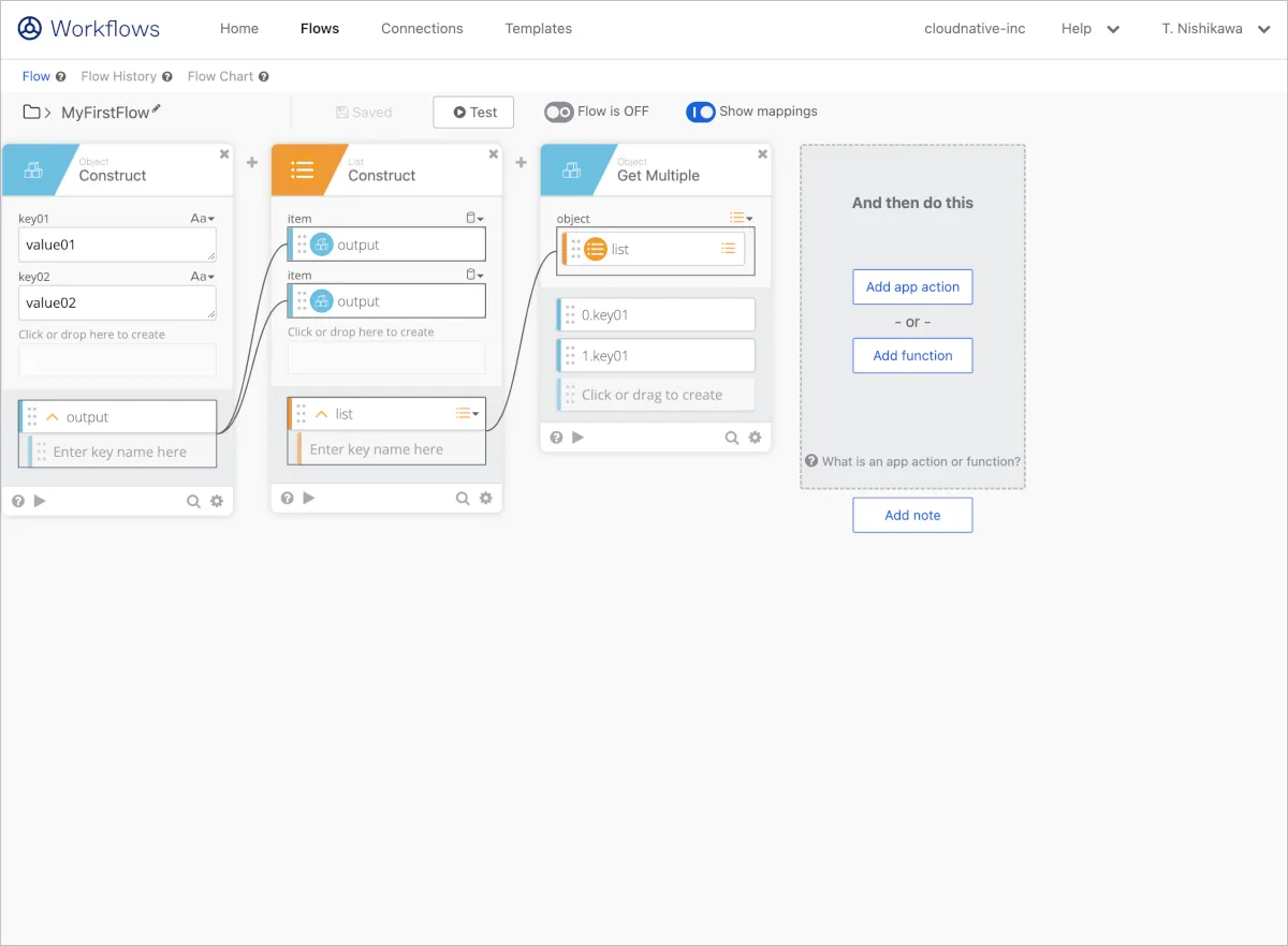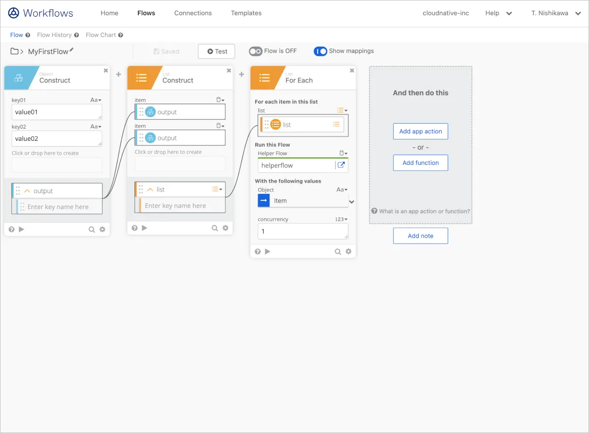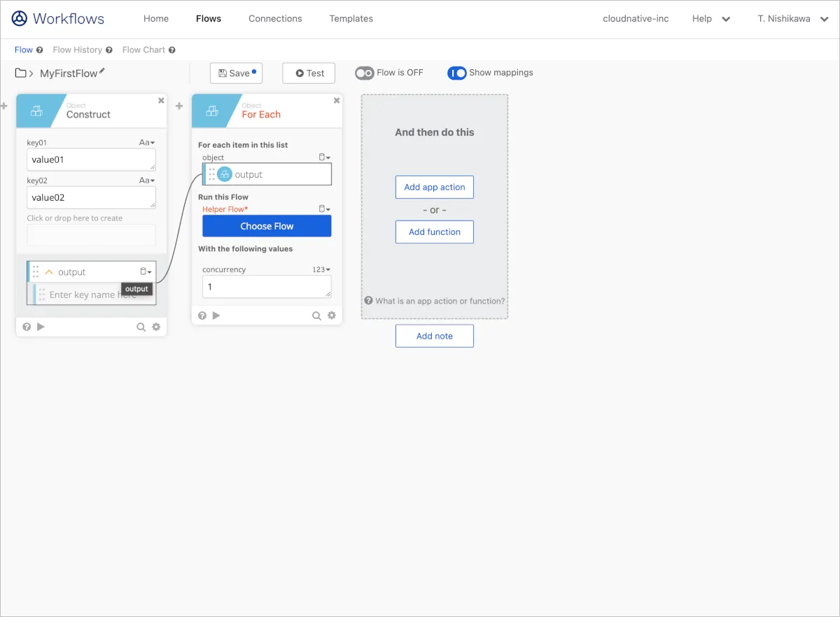 オブジェクト内のアイテムを1件1件Helper Flowに渡して処理を行う場合に利用します。入力はオブジェクト形式のデータである必要があります。