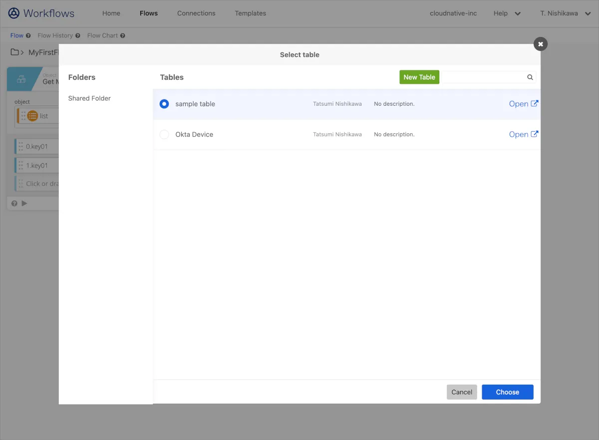 Choose Tableをクリックし、フォルダー内のテーブルを指定するか、New Tableから新規作成を行います。