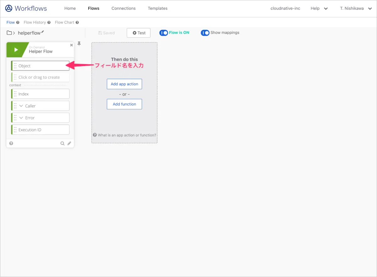 別のFlowから呼び出されるために設定します。呼び出し元FlowのFor EachやReduceなどのファンクションカードからデータを受け取るためにフィールド名を入力しておきます。呼び出し元のFlowではこのHelper Flowを指定し、フィールドに渡す値を指定します。