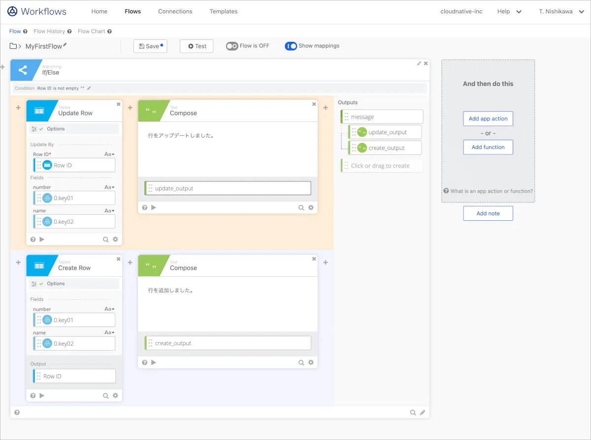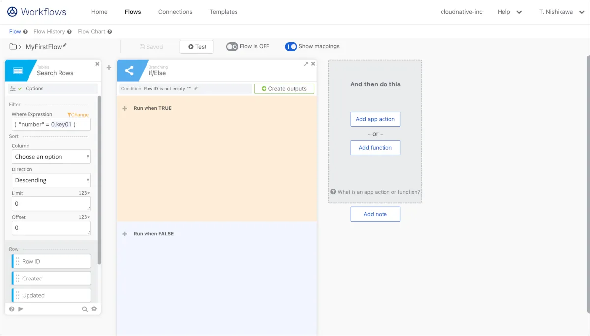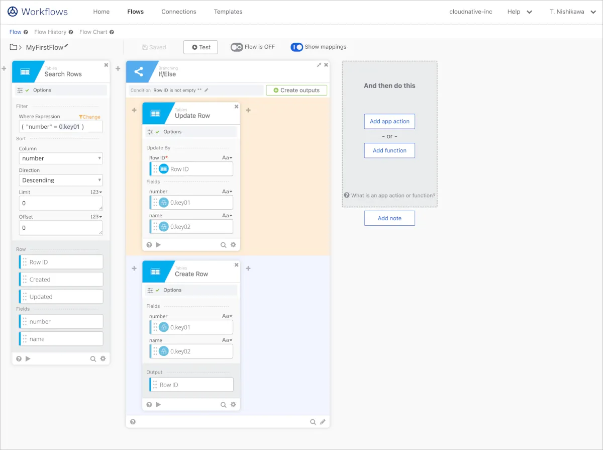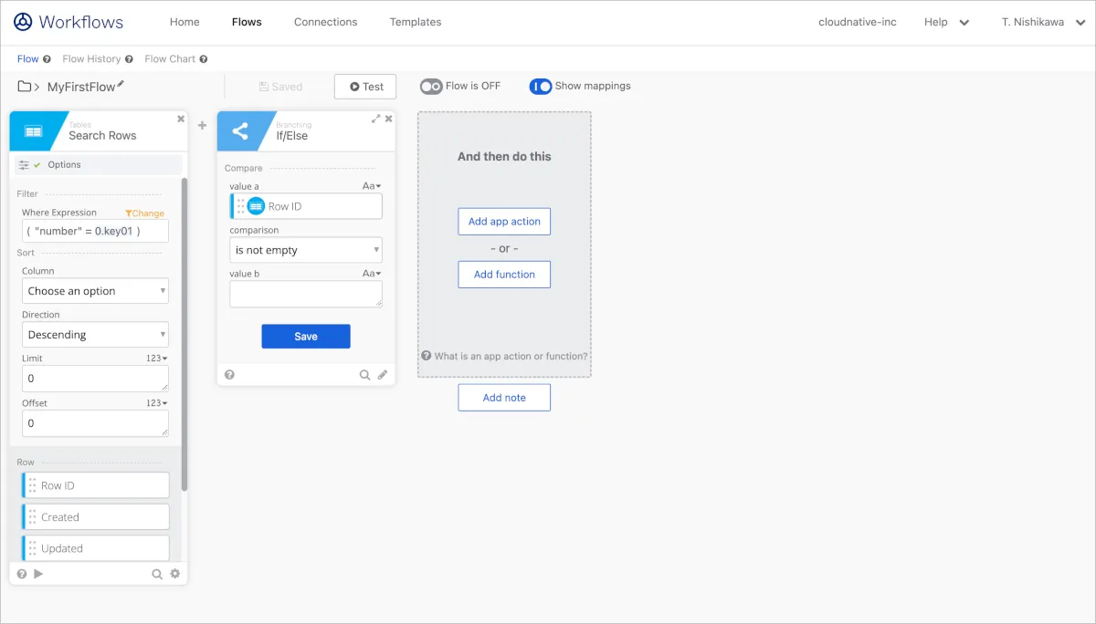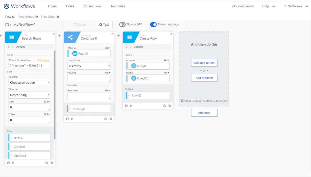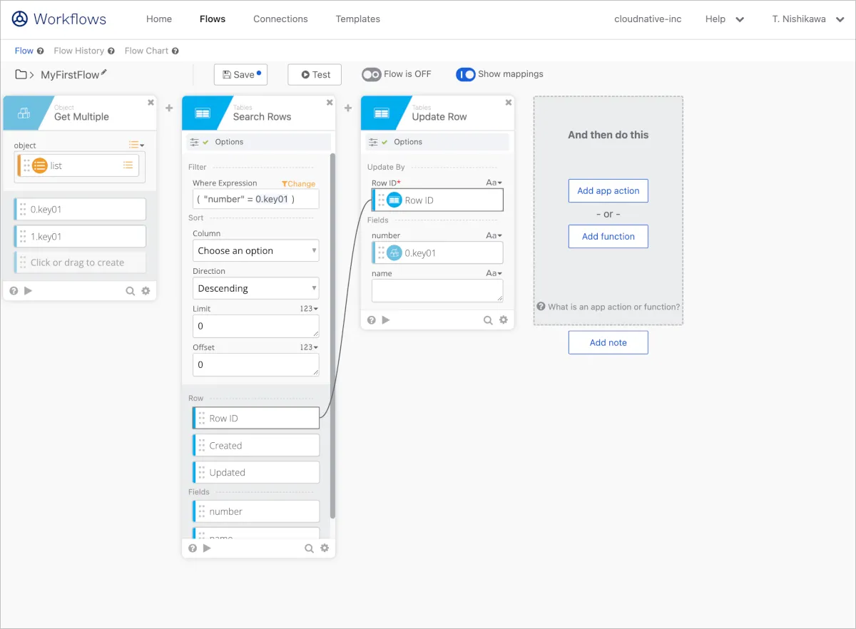 Search Rowsと同様にテーブルを指定しておきます。Row IDを指定する必要があるため事前にSearch Rowsを実行しておく必要があります。アップデートを行いたいFields(カラム)に値を指定します。