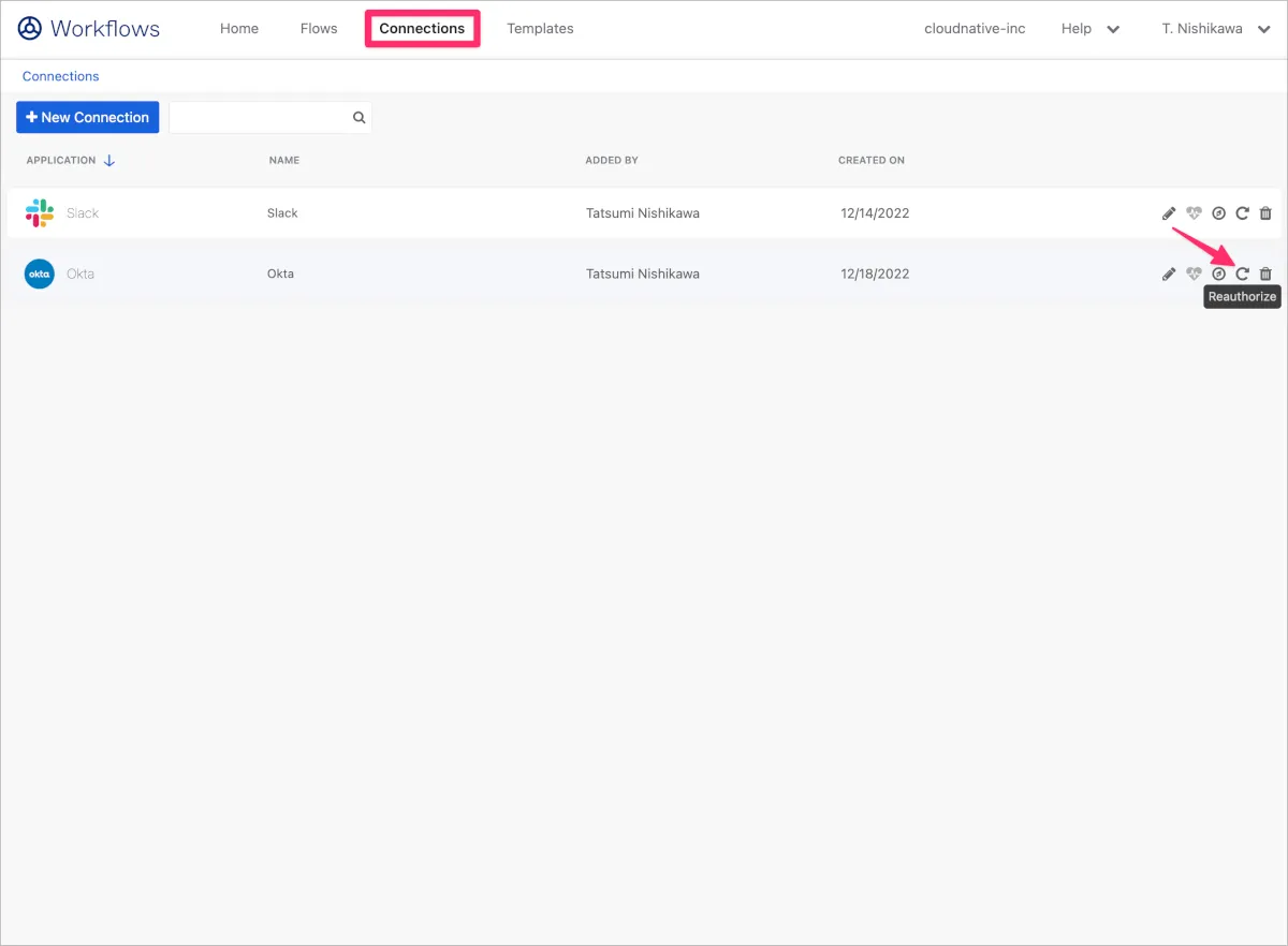 権限付与をした場合は改めて、ConnectionsメニューからReauthorizeをする必要があります。