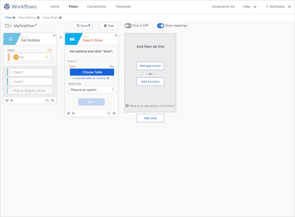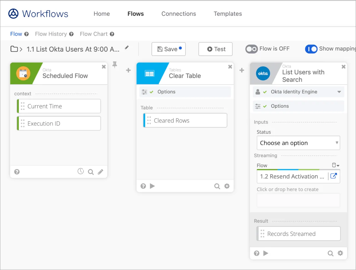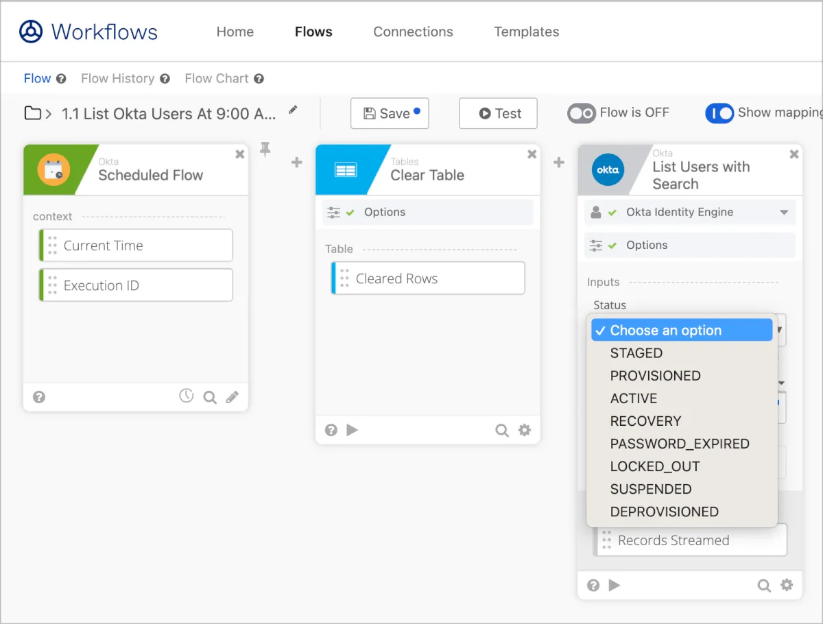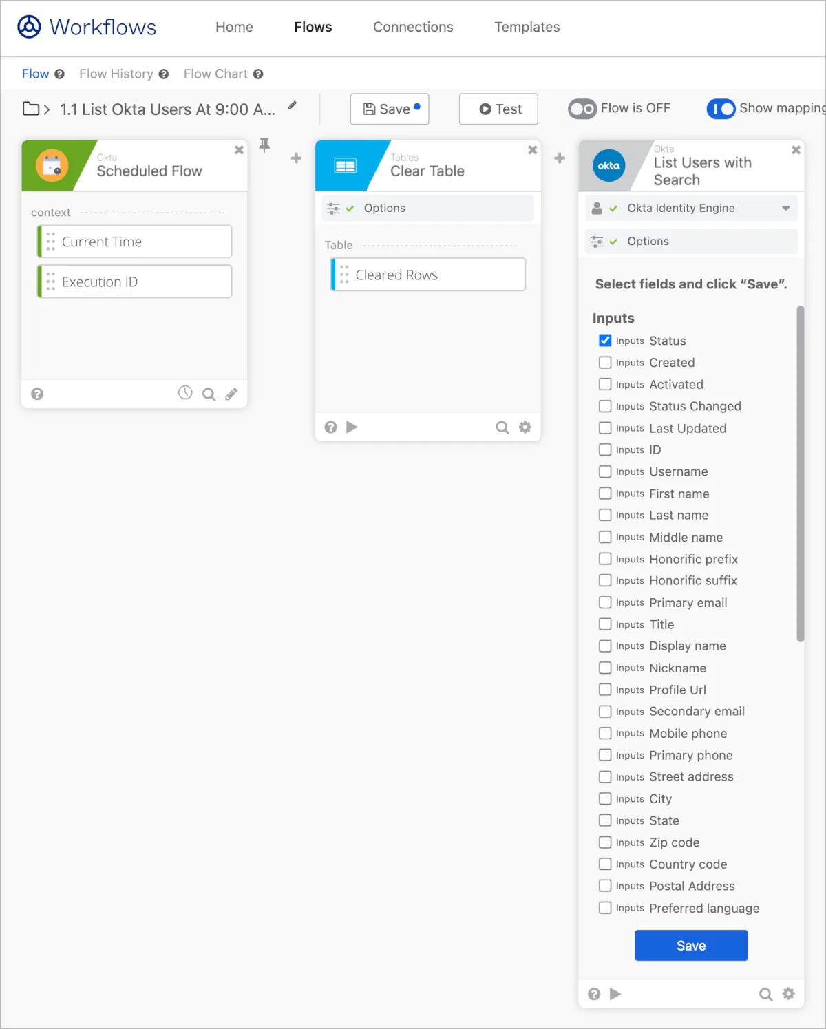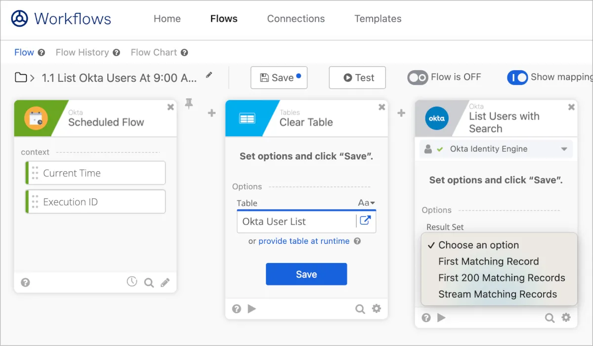 検索オプションでFirst matching Record、First 200 Matching RecordもしくはStream Matching Recordsから選択しSaveをクリックします。Oktaユーザーが多い場合はFirst 200 Matching RecordかStream Matching Recordsを選択するとよいでしょう。First 200 Matching Recordの場合はList形式で出力されます。Stream Matching Recordsの場合はHelper Flowを指定し、処理を行います。
