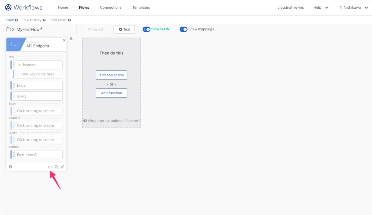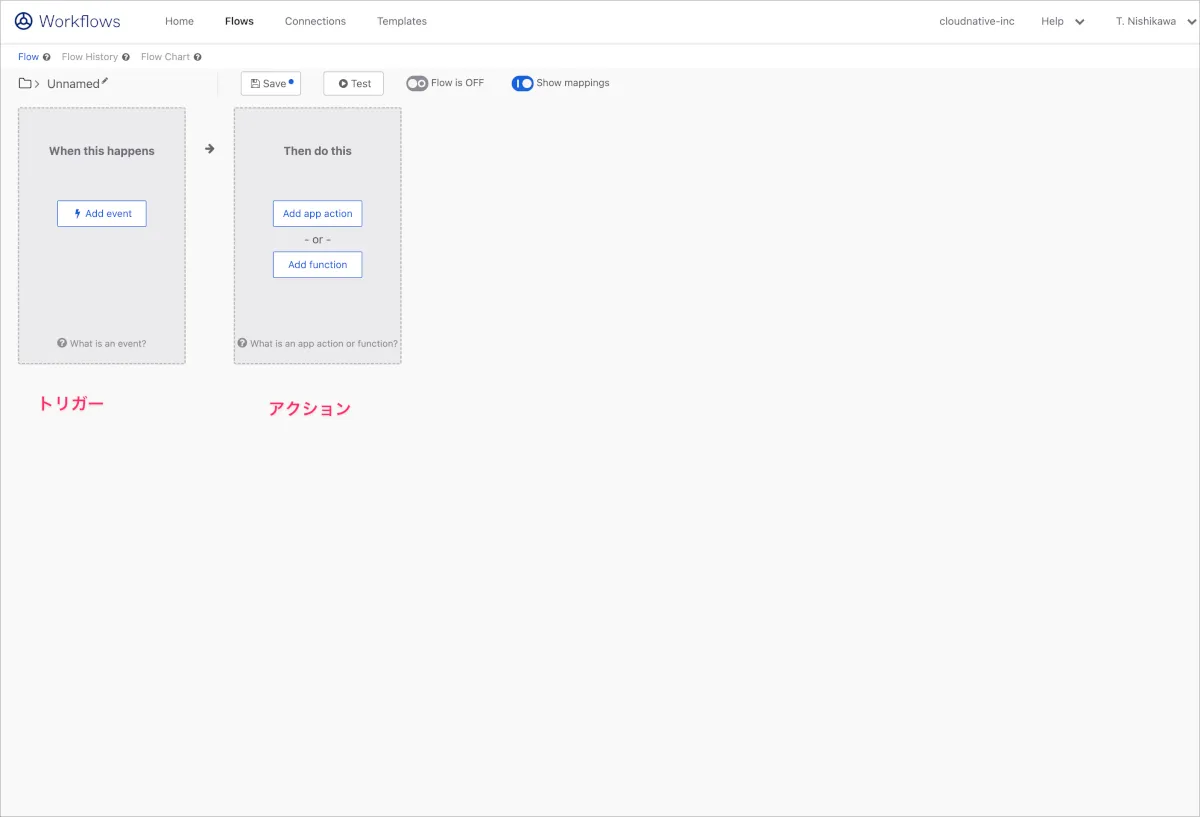 別タブで以下のような画面が表示されるので上部のメニューからFlowsをクリックします。