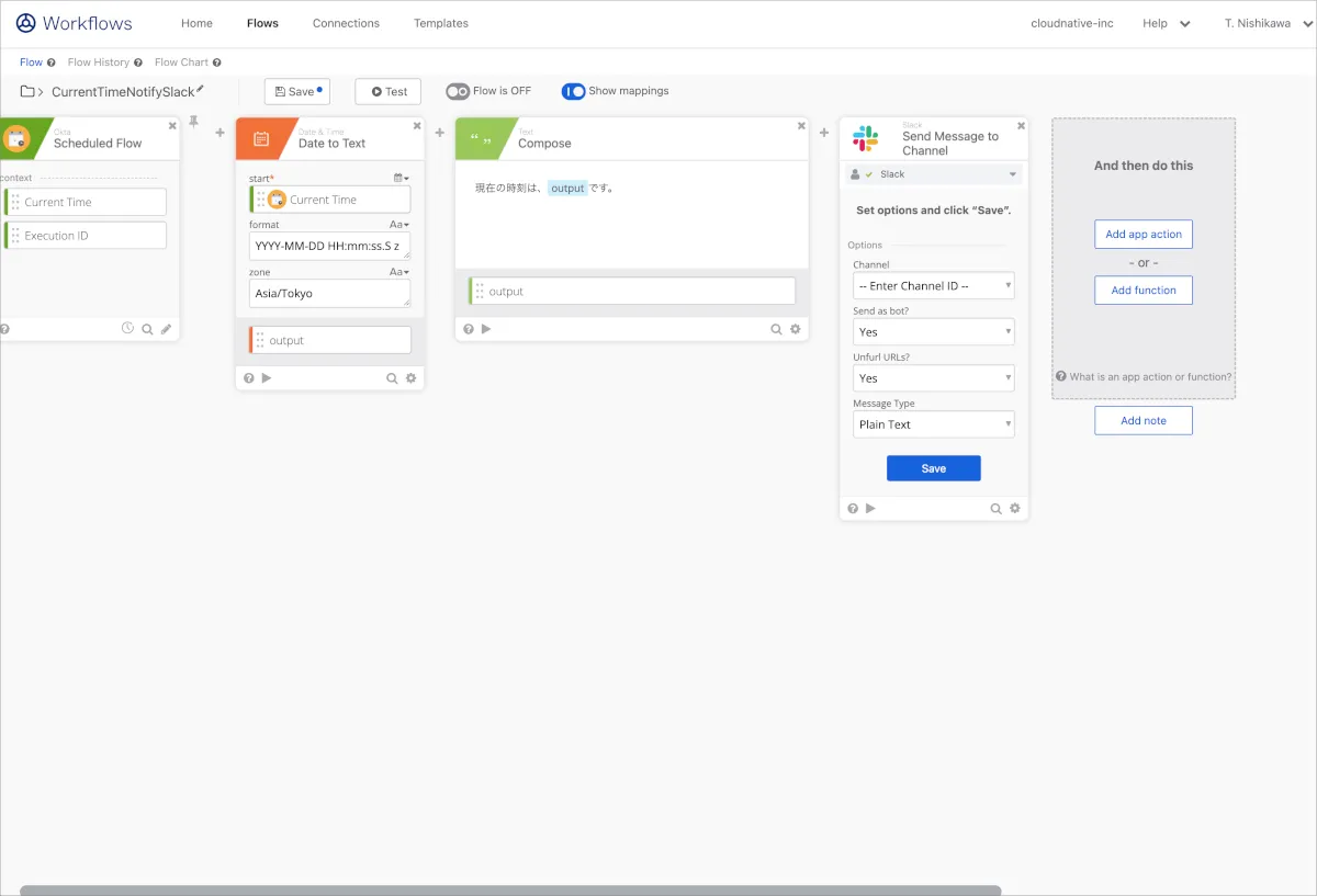 OptionのChannelでEnter Channel IDを指定し、Send as bot?をYesとします。Botとして投稿しない場合はFlow作成者の投稿となってしまうのでBotにしておくのがよいでしょう。