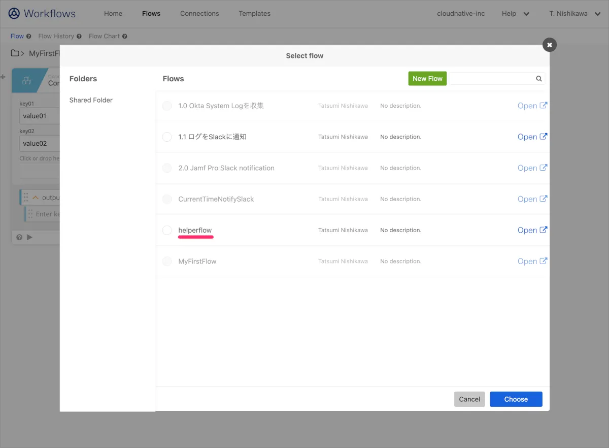 Run this FlowのChoose Flowをクリックし、フォルダを選択しトリガーがHelper FlowとなっているFlowを選択します。下図ではhelpeflowという名称のFlowを選択しました。なお、New Flowから新規作成を行うことも可能です。