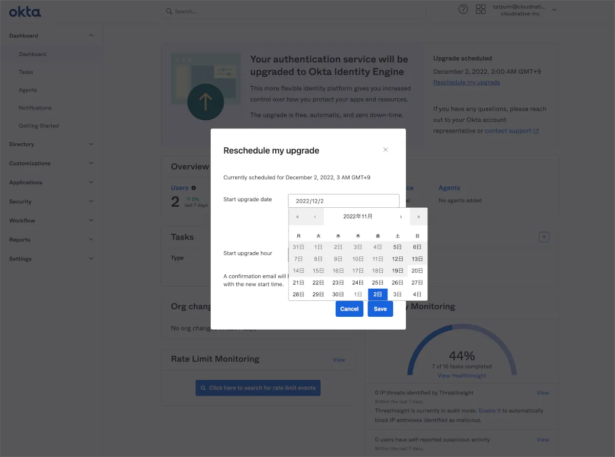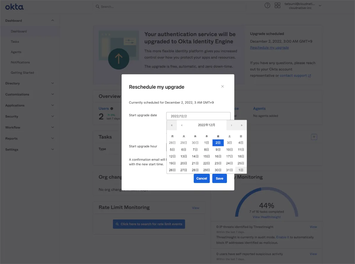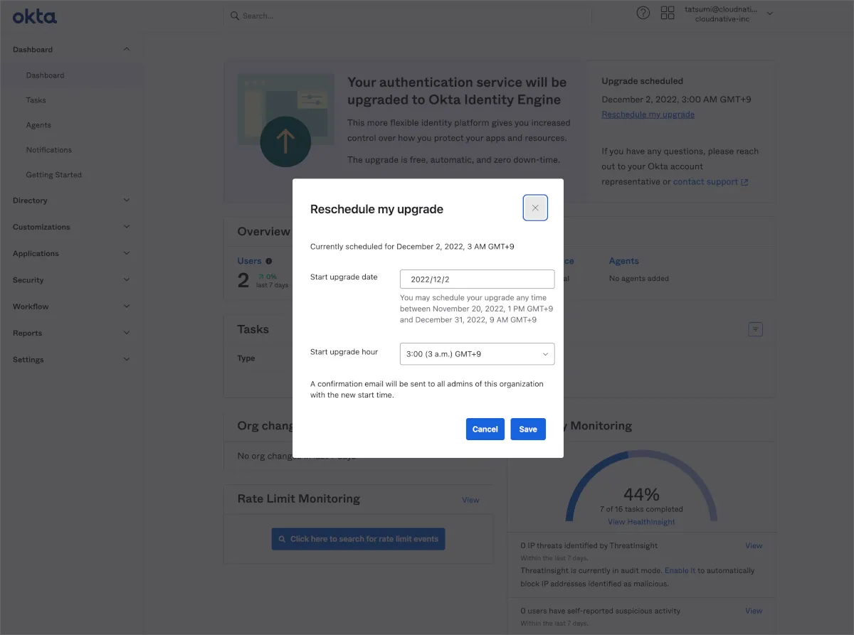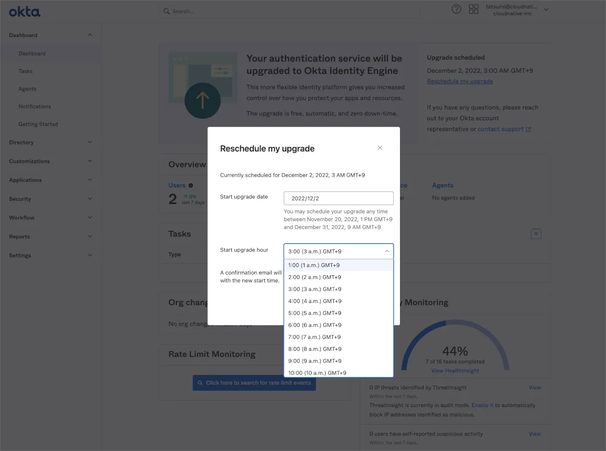 弊社の検証環境はOkta社から直接手配したものなので、Okta Japanの担当者に問い合わせた結果、アップグレード可能であるという判定でした。いくつか提示される候補日のうち最短であった2022年12月01日10:00 PSTつまり日本時間で12月02日深夜3時を指定しました。