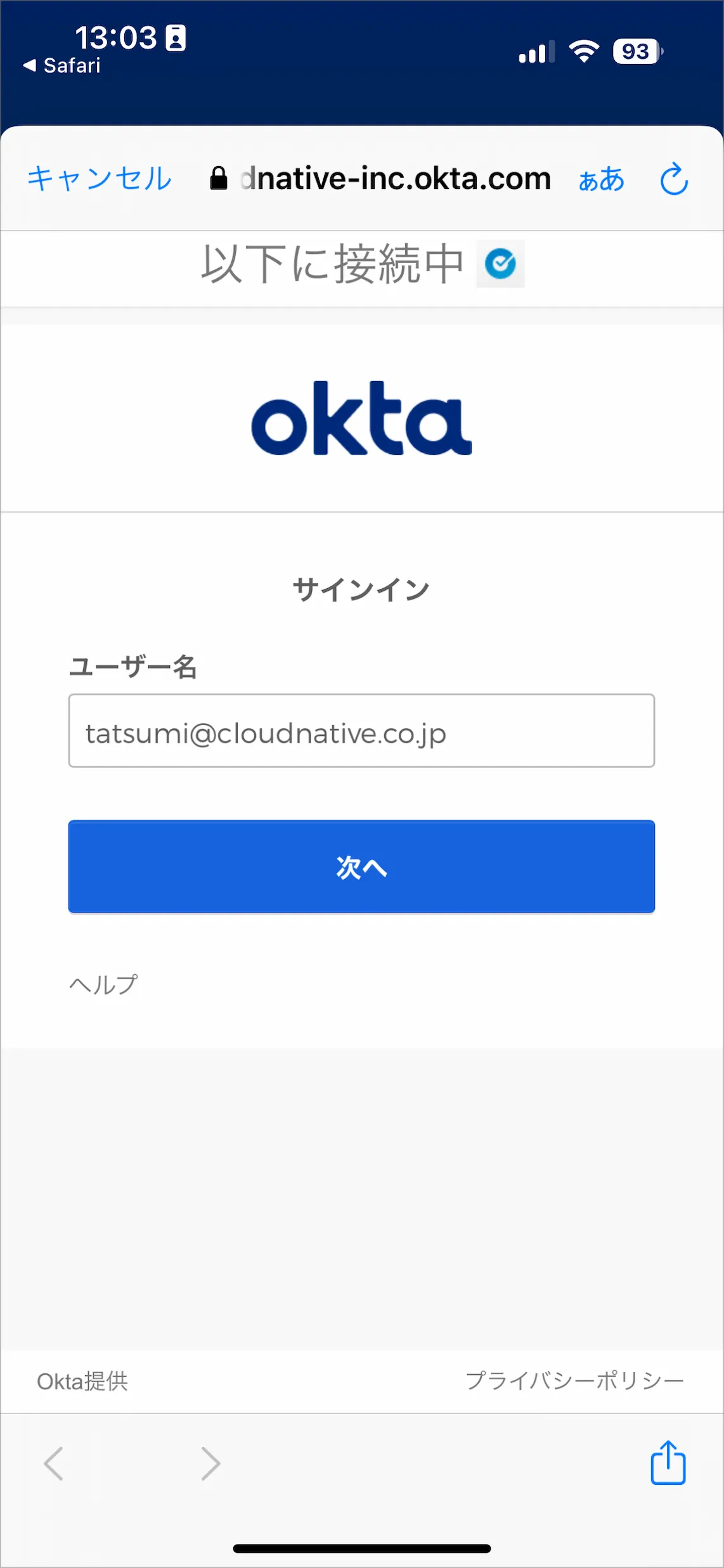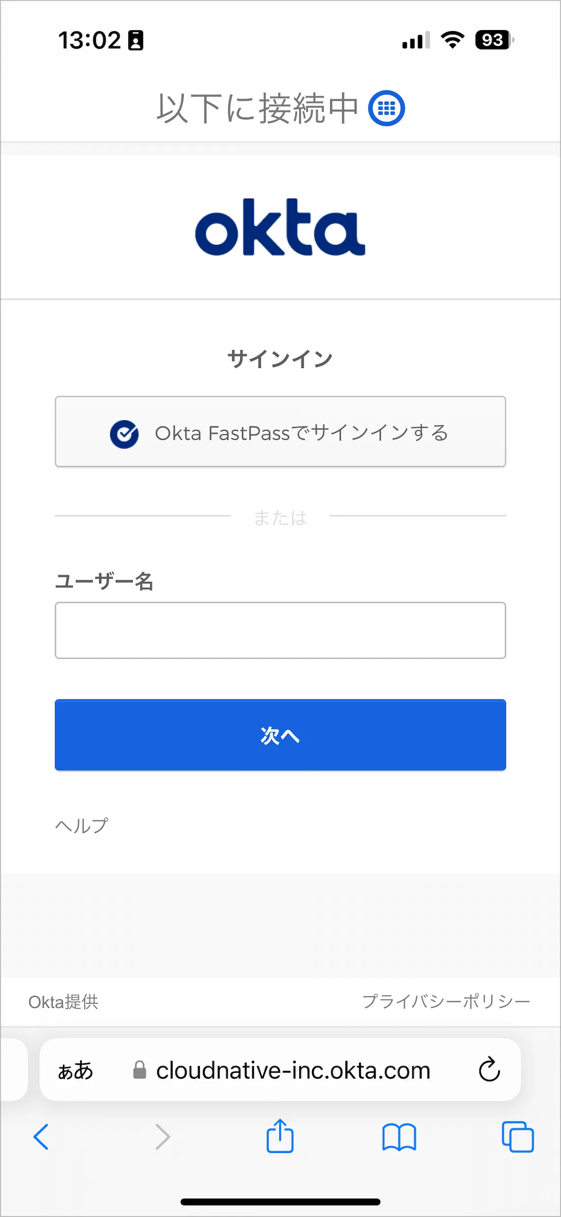 - アプリ内ブラウザでユーザー名を入力し、次へをタップします。